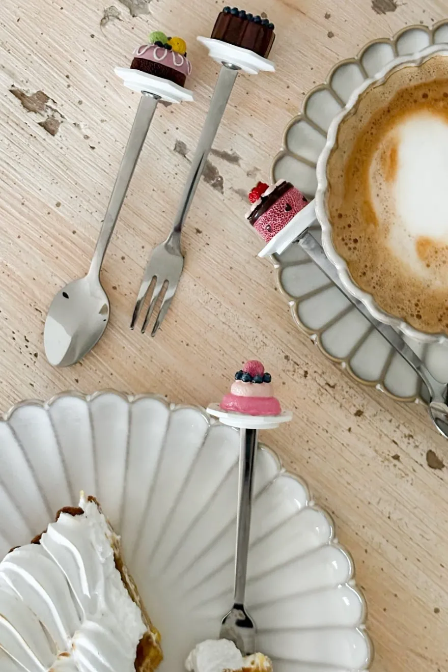 Este set de dos cucharitas y dos tenedores de postre combina originalidad y color. Cada pieza presenta un diseño único, con una delicada tarta en su extremo, perfecto para disfrutar de postres en ocasiones especiales.