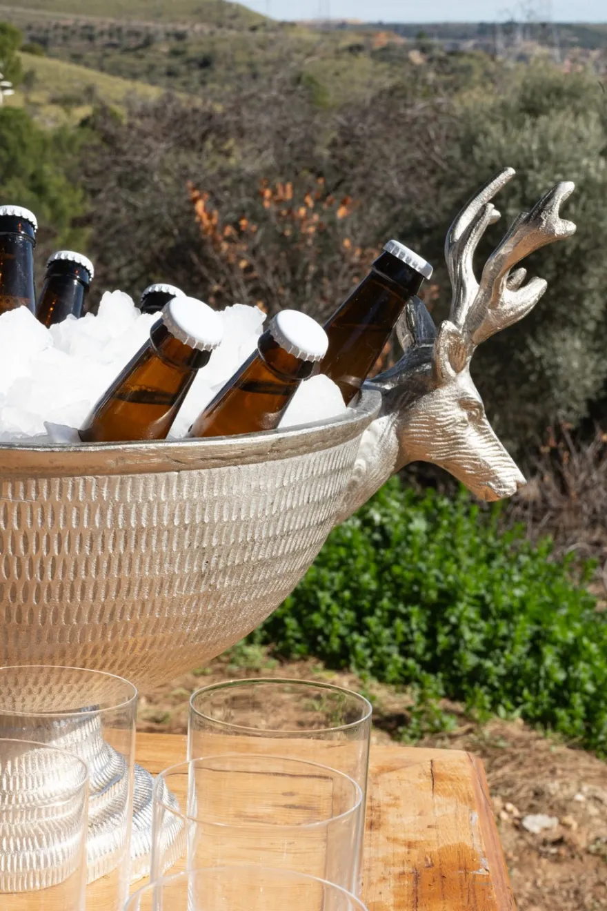 Champanera o cubitera de aluminio tallada con pie y asas con diseño de ciervo, ideal para interiores y exteriores, e incluso para el campo.