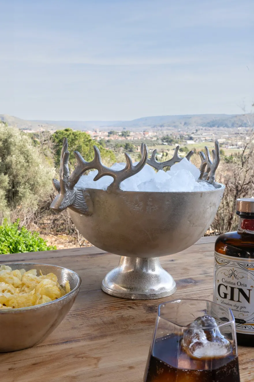 Champanera o cubitera de aluminio con pie y asas con diseño de ciervo, ideal para interiores y exteriores, e incluso para el campo.