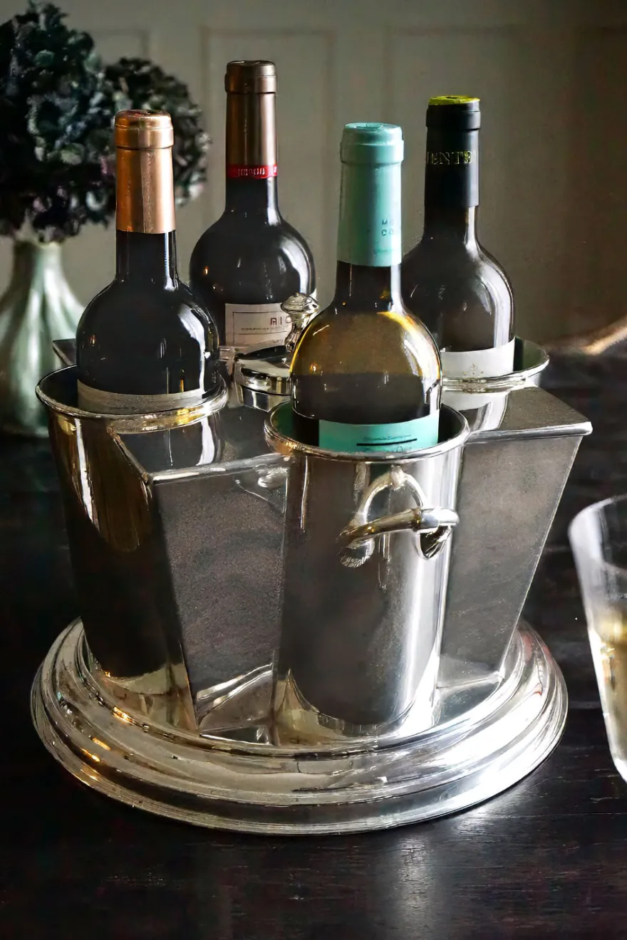 Esta cubitera para cuatro botellas bañada en plata de ley, es una pieza que combina elegancia y sofisticación en su diseño, ideal para añadir un toque de lujo a tu mesa. Un accesorio elegante y atemporal para ocasiones especiales y un regalo para toda la vida.