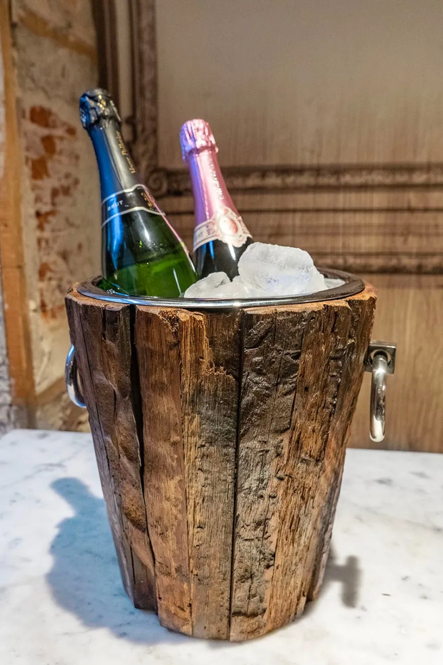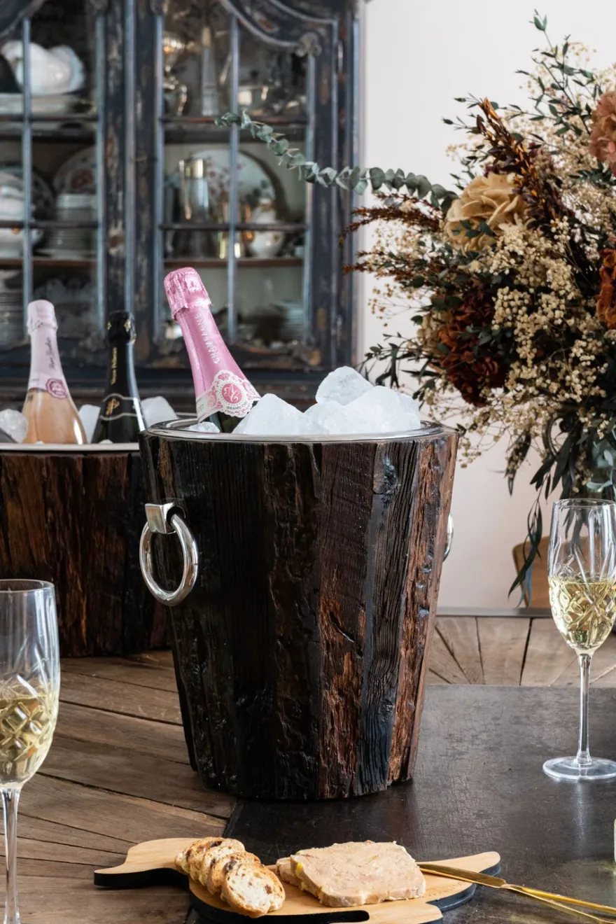 Cubitera alta con revestimiento rústico de madera de teca natural en una tonalidad oscura, y de acero inoxidable de alta calidad en su interior.