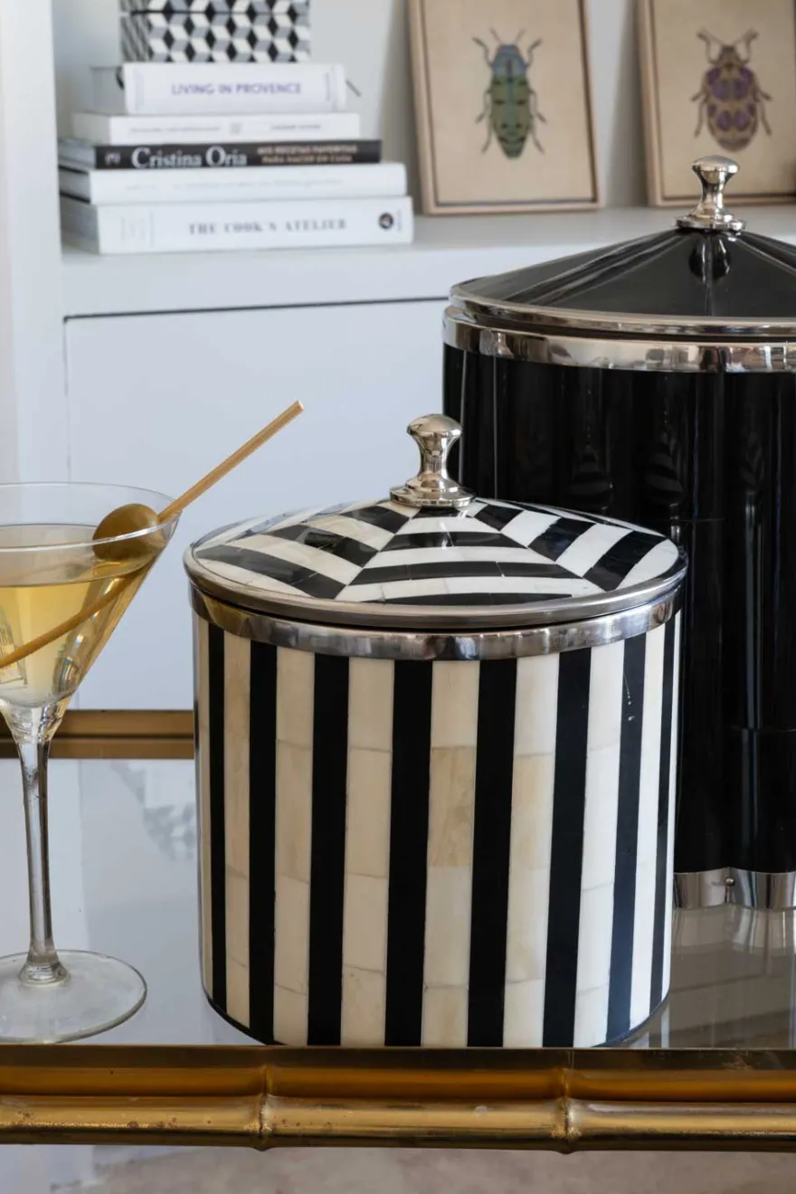 Cubitera de hueso con diseño de rayas blancas y negras. Todas nuestras cubiteras están elaboradas con patrones únicos, completamente fabricadas de manera artesanal. Son diseñadas y pulidas de tal forma que su acabado permanece como el primer día durante mucho tiempo.