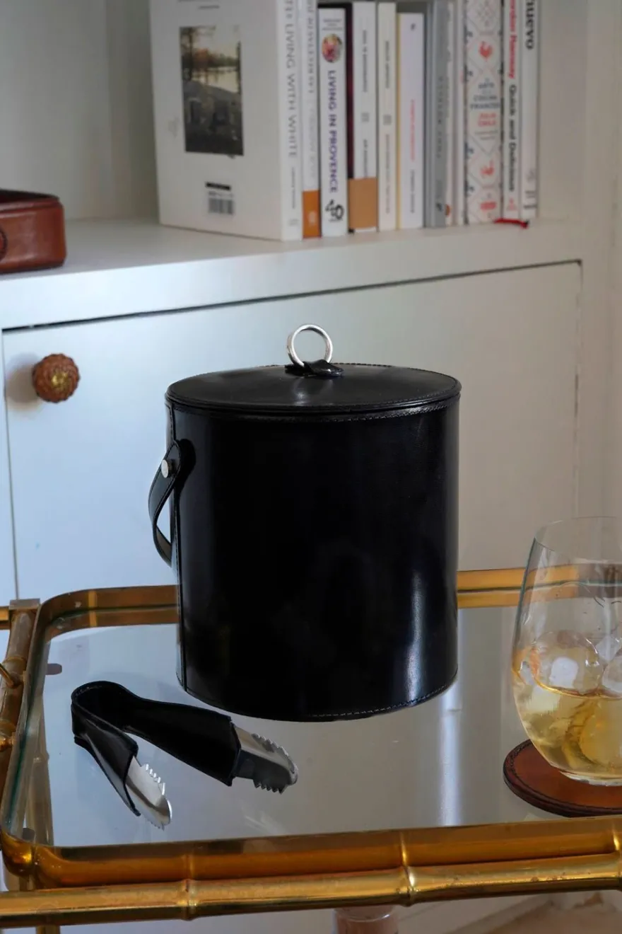 Esta cubitera de cuero con tapa es un accesorio elegante y funcional que al estar revestida de cuero negro, le da un aspecto sofisticado y lujoso, ideal para complementar la decoración de una mesa o barra.