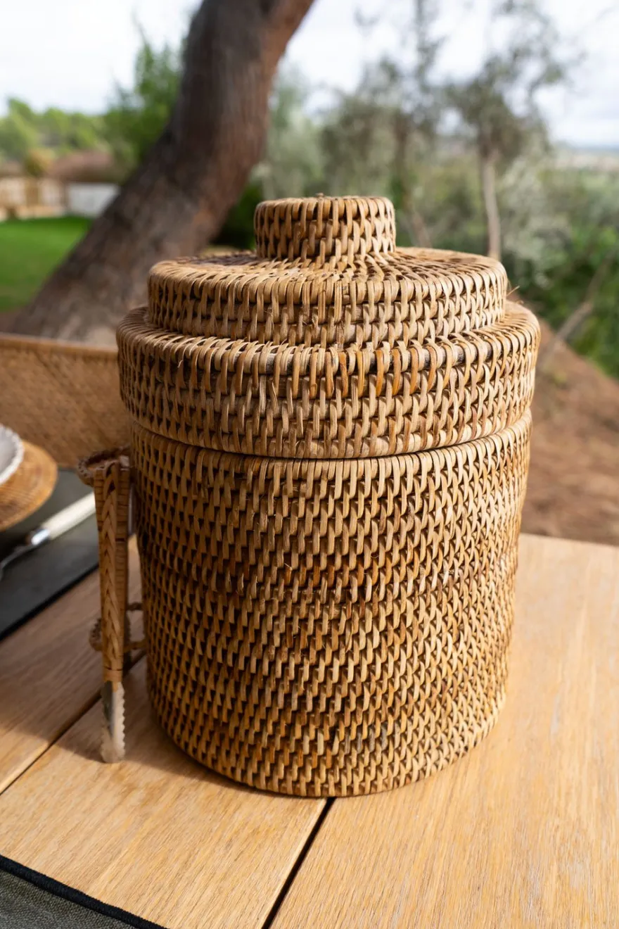 Cubitera de ratán con tapa con diseño de doble altura y pinza, perfecta para reuniones informales o celebraciones especiales. Esta colección combina la belleza del material natural con la funcionalidad y el diseño contemporáneo.