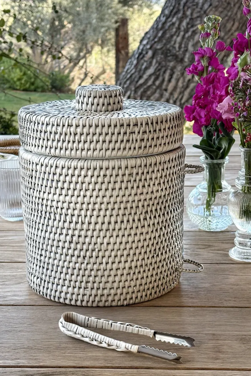 Cubitera de ratán blanca con tapa y pinza, perfecta para reuniones informales o celebraciones especiales. Esta colección combina la belleza del material natural con la funcionalidad y el diseño contemporáneo.
