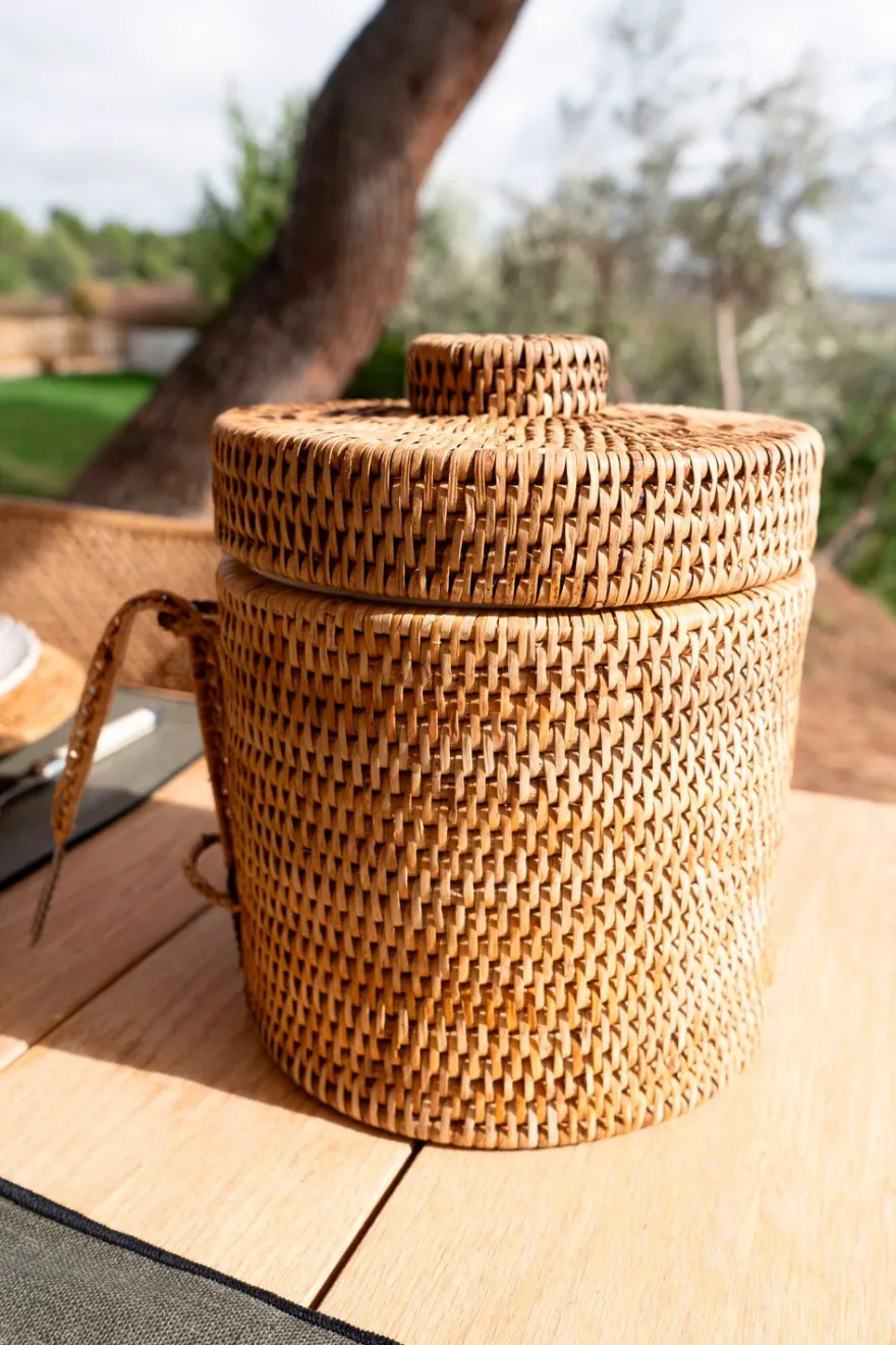 Cubitera de ratán con tapa y pinza, perfecta para reuniones informales o celebraciones especiales. Esta colección combina la belleza del material natural con la funcionalidad y el diseño contemporáneo.