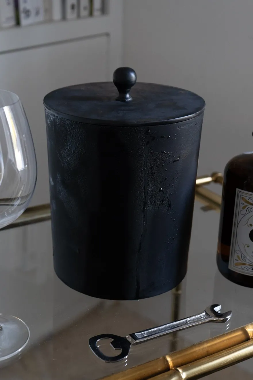 Cubitera mediana negra de aluminio con tapa. Su acabado mate aporta un toque sofisticado a cualquier mesa o celebración.