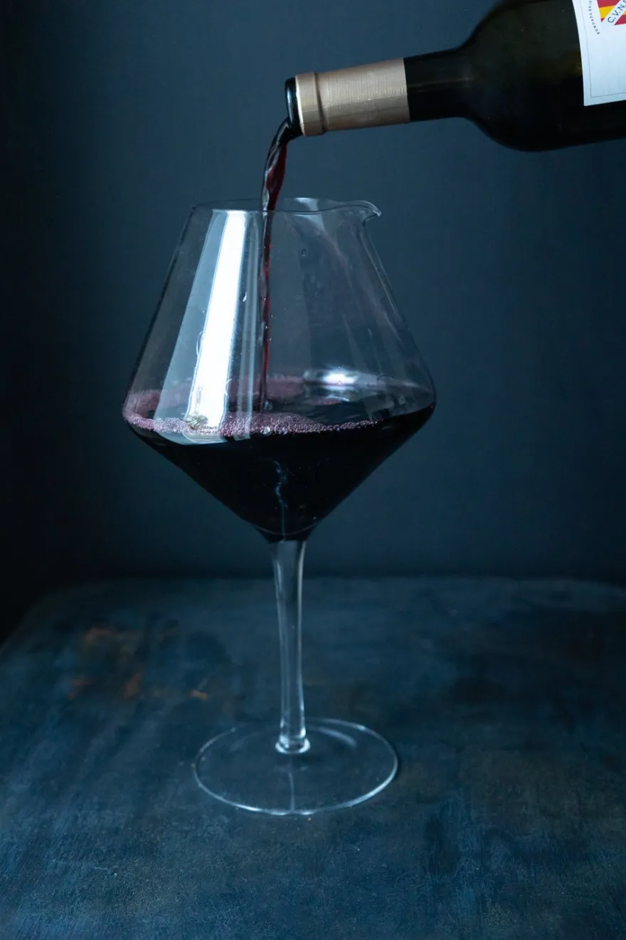 Original decantador de vidrio con diseño de copa de vino. Gracias a su elegante forma, el vino recibe suficiente aire para que pueda desarrollar sus aromas.