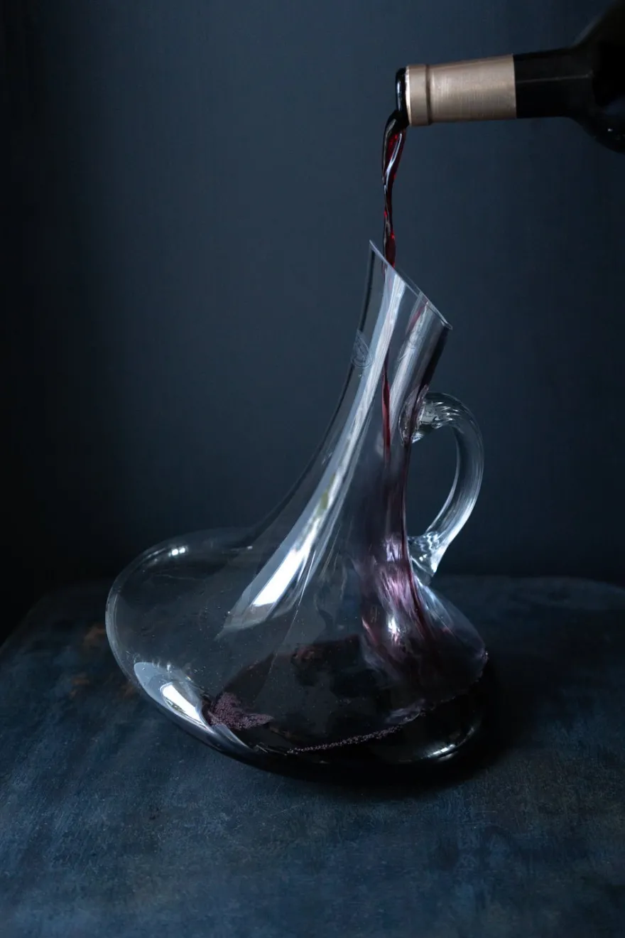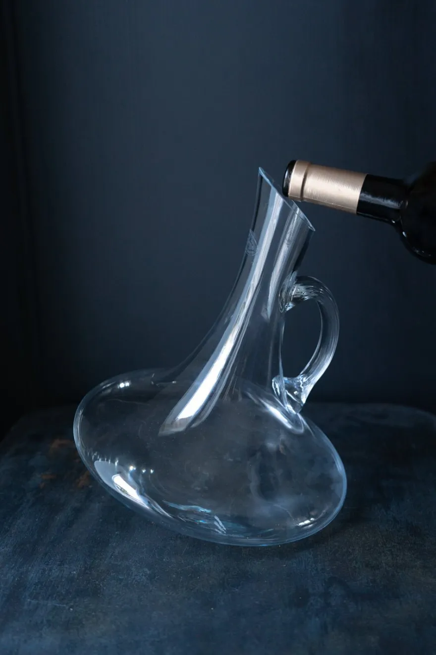 Decantador de vidrio con diseño oblicuo y asa. Gracias a su elegante forma, el vino recibe suficiente aire para que pueda desarrollar sus aromas.