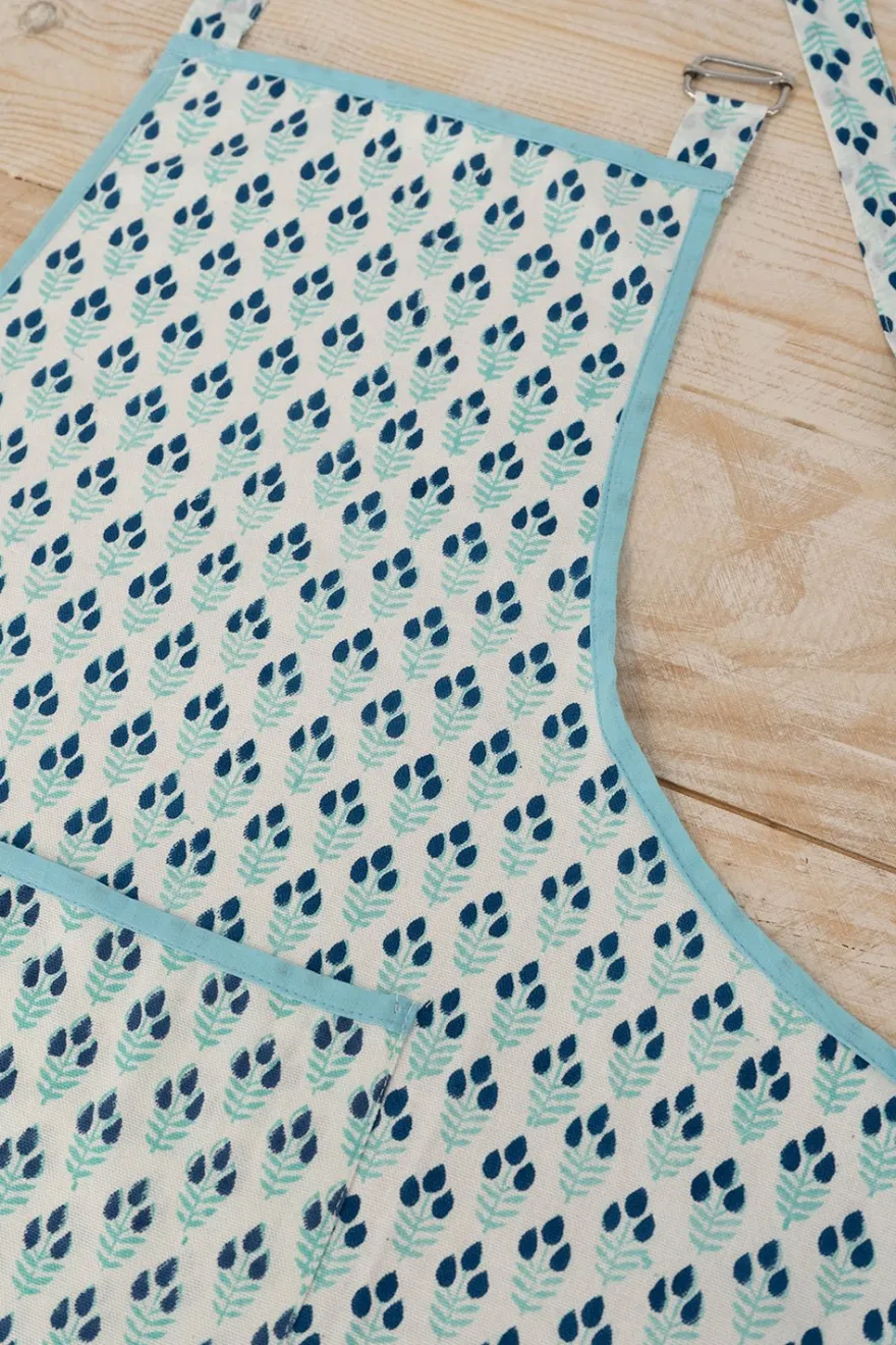 Delantal con bolsillo en la parte frontal, 100% algodón con diseño Mira, cuyo significado es “Océano”, pintado a mano en la India.