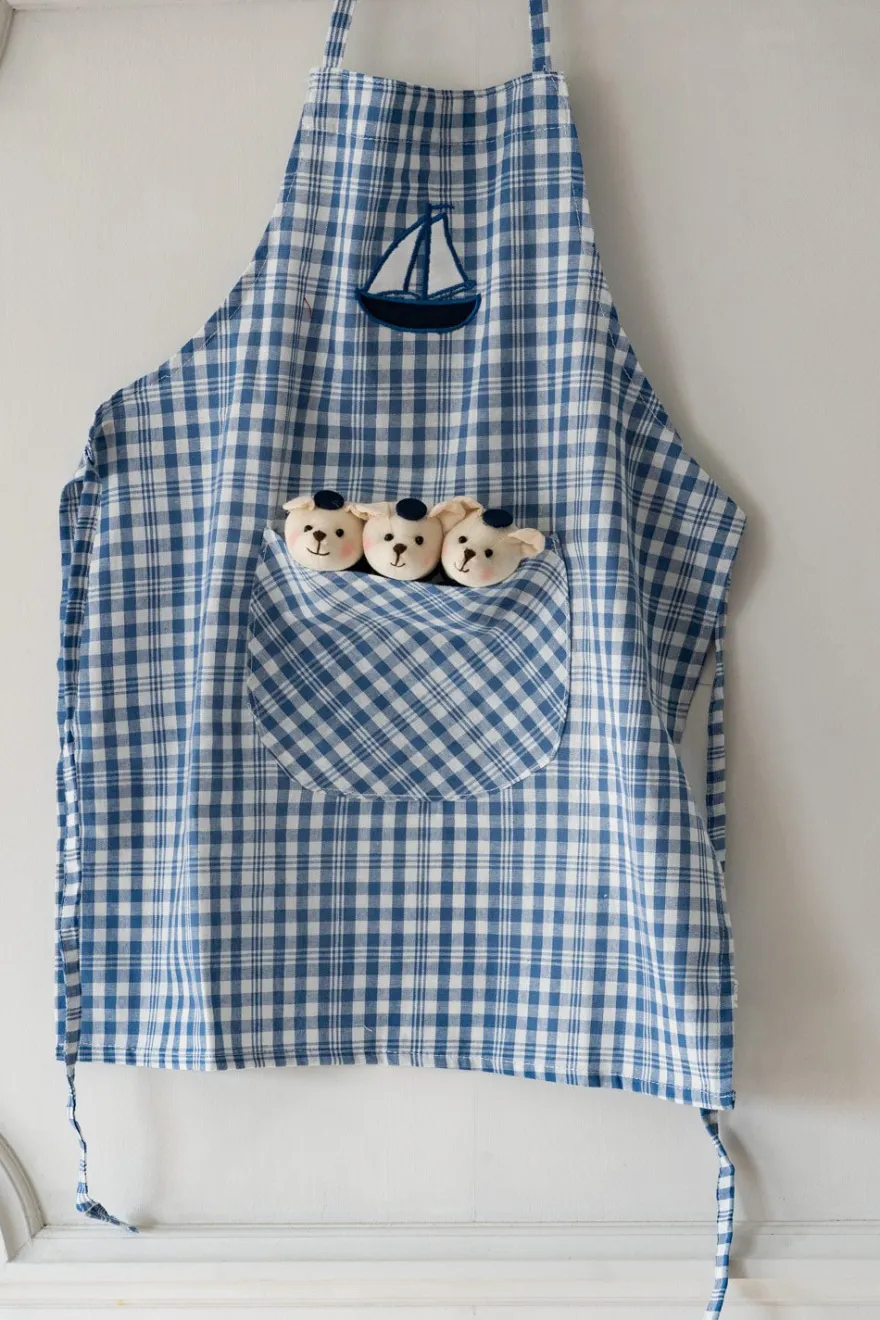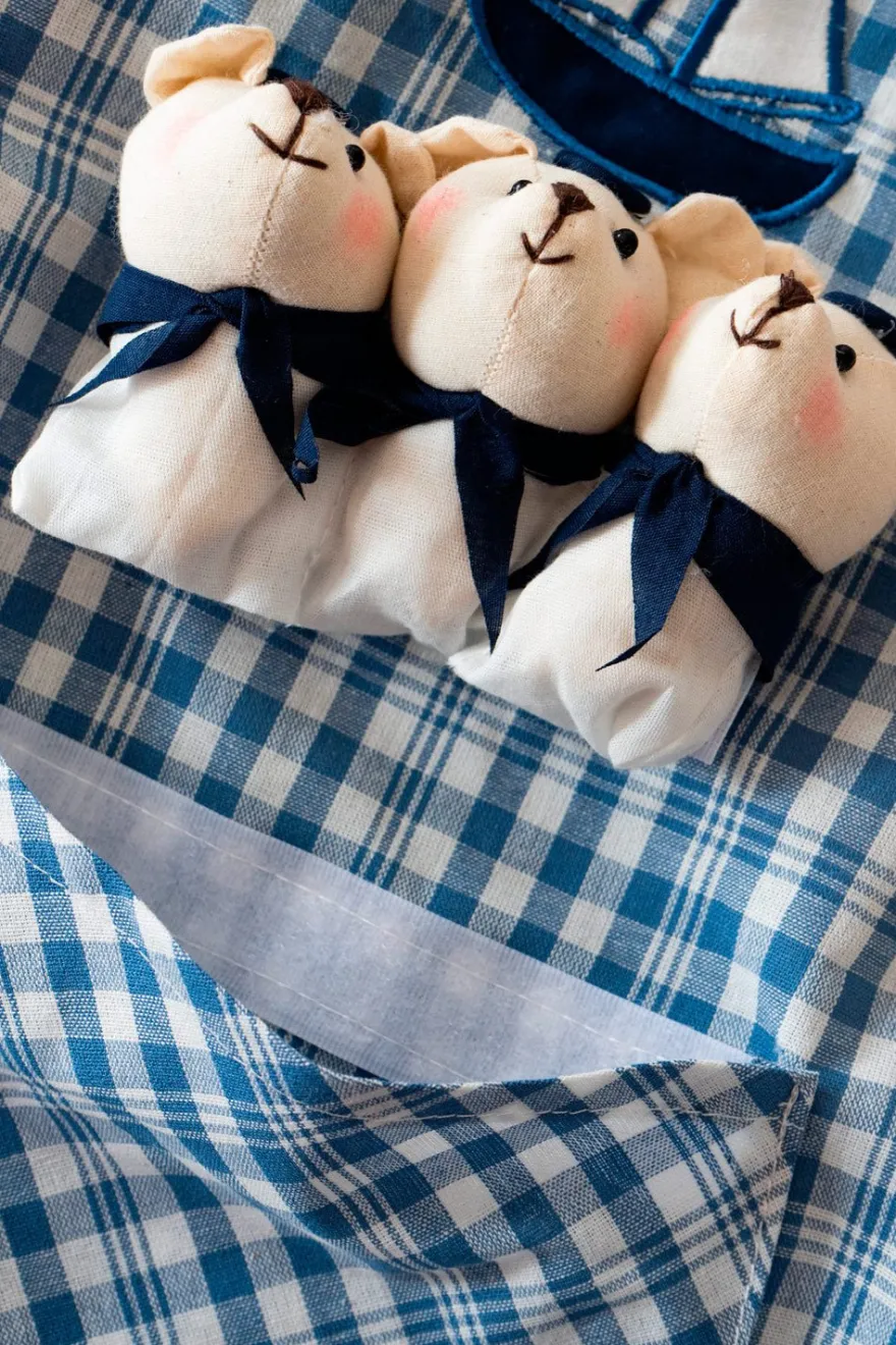 Disponibles en dos tamaños diferentes, con diseño de cuadros azules y blancos, y con ositos en el bolsillo frontal y velero.