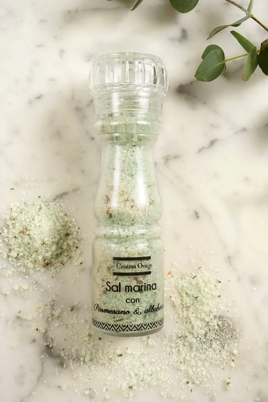 Ingredientes: Sal marina, parmesano, albahaca, aceite esencial de albahaca