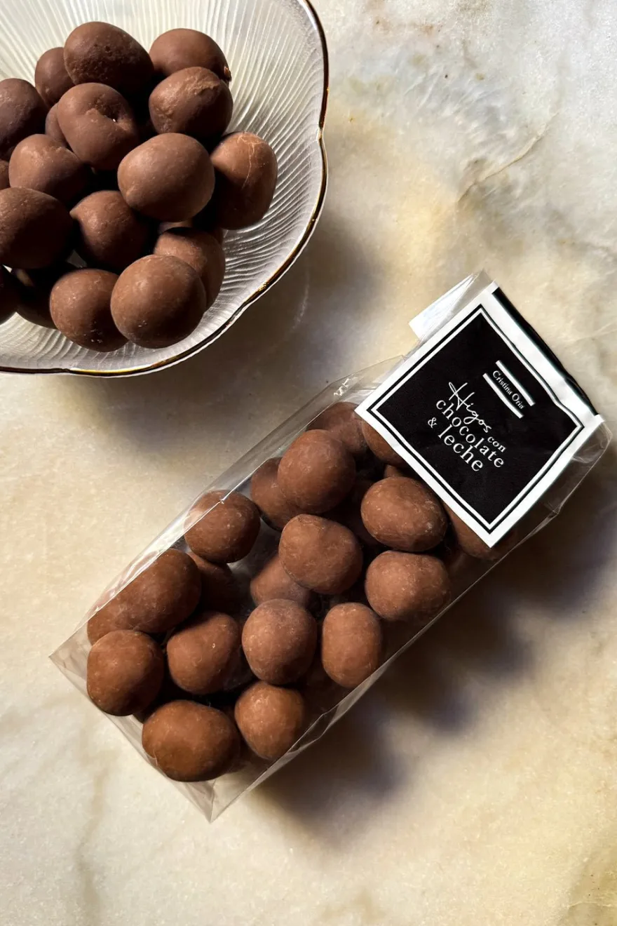 Higos secos recubiertos de chocolate con leche en una proporción de 60% fruto seco y 40% chocolate. Perfecto como snack.