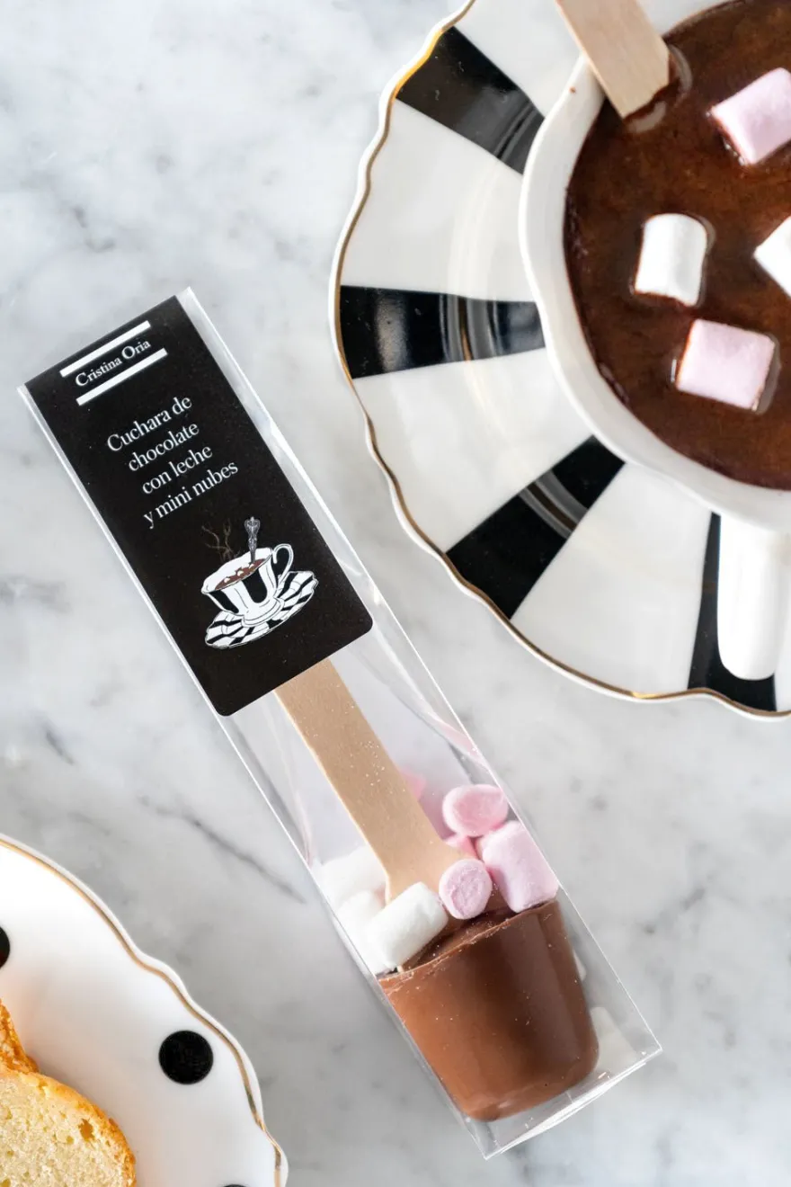 Esta cuchara de chocolate con mini nubes es un dulce y divertido detalle para estas fiestas. Hecha con chocolate de alta calidad, está adornada con pequeñas nubes que, al sumergirla en un vaso de leche caliente o en el café, se derriten y se fusionan con el chocolate, creando una bebida suave y cremosa con un toque esponjoso.