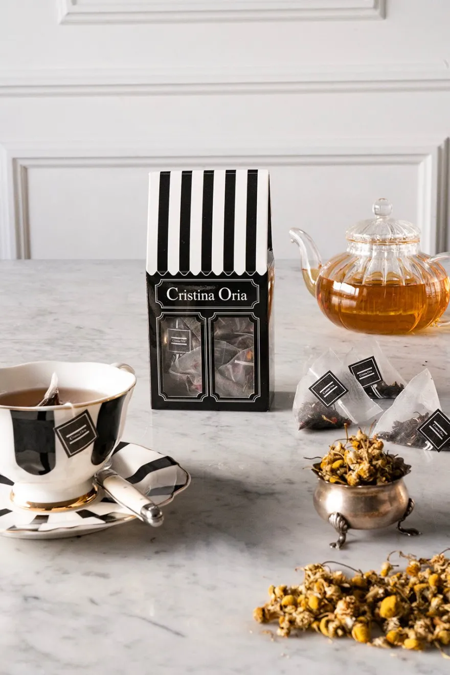 Caja con diseño propio Cristina Oria con quince pirámides en su interior de manzanilla dulce.