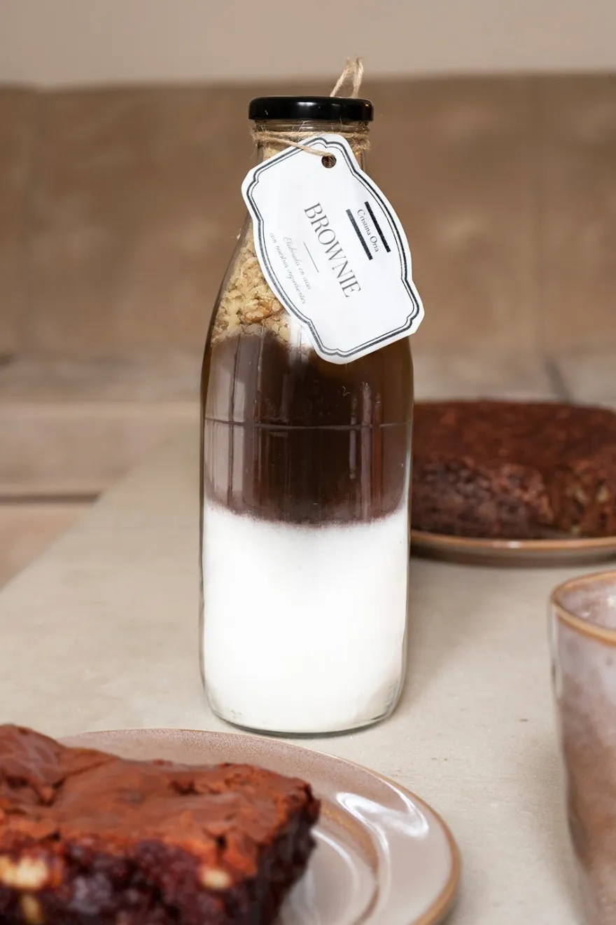 Botella de cristal rellena de los ingredientes sólidos para elaborar en casa un delicioso brownie al estilo CO.