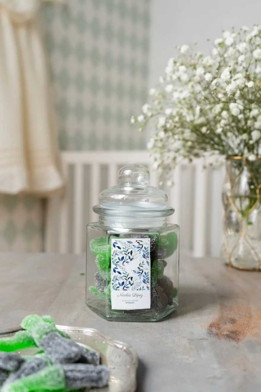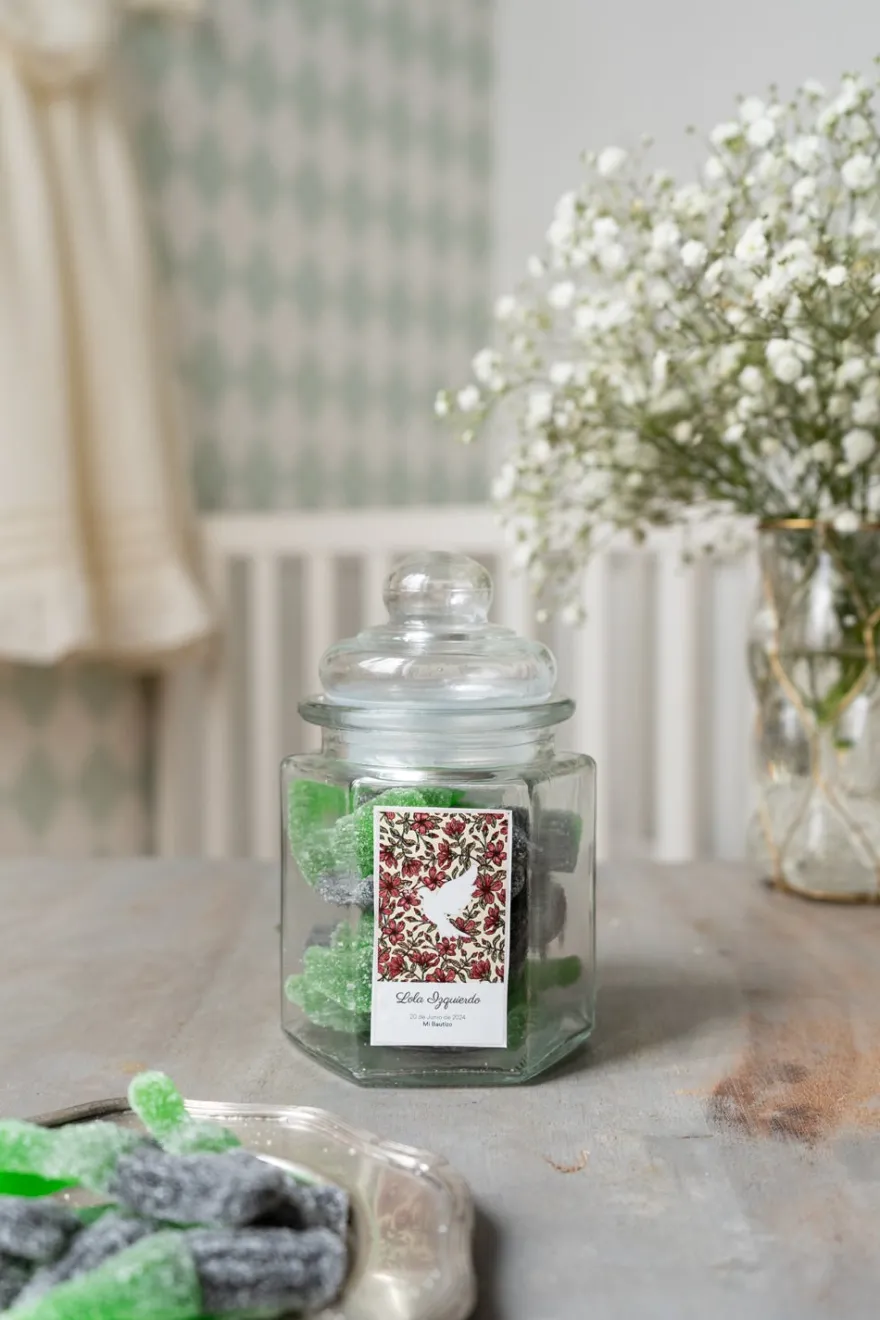 Regala a tus invitados unas golosinas de coca cola sin gluten en tarro de cristal hexagonal personalizado con un recordatorio con el nombre y fecha del bautizo.