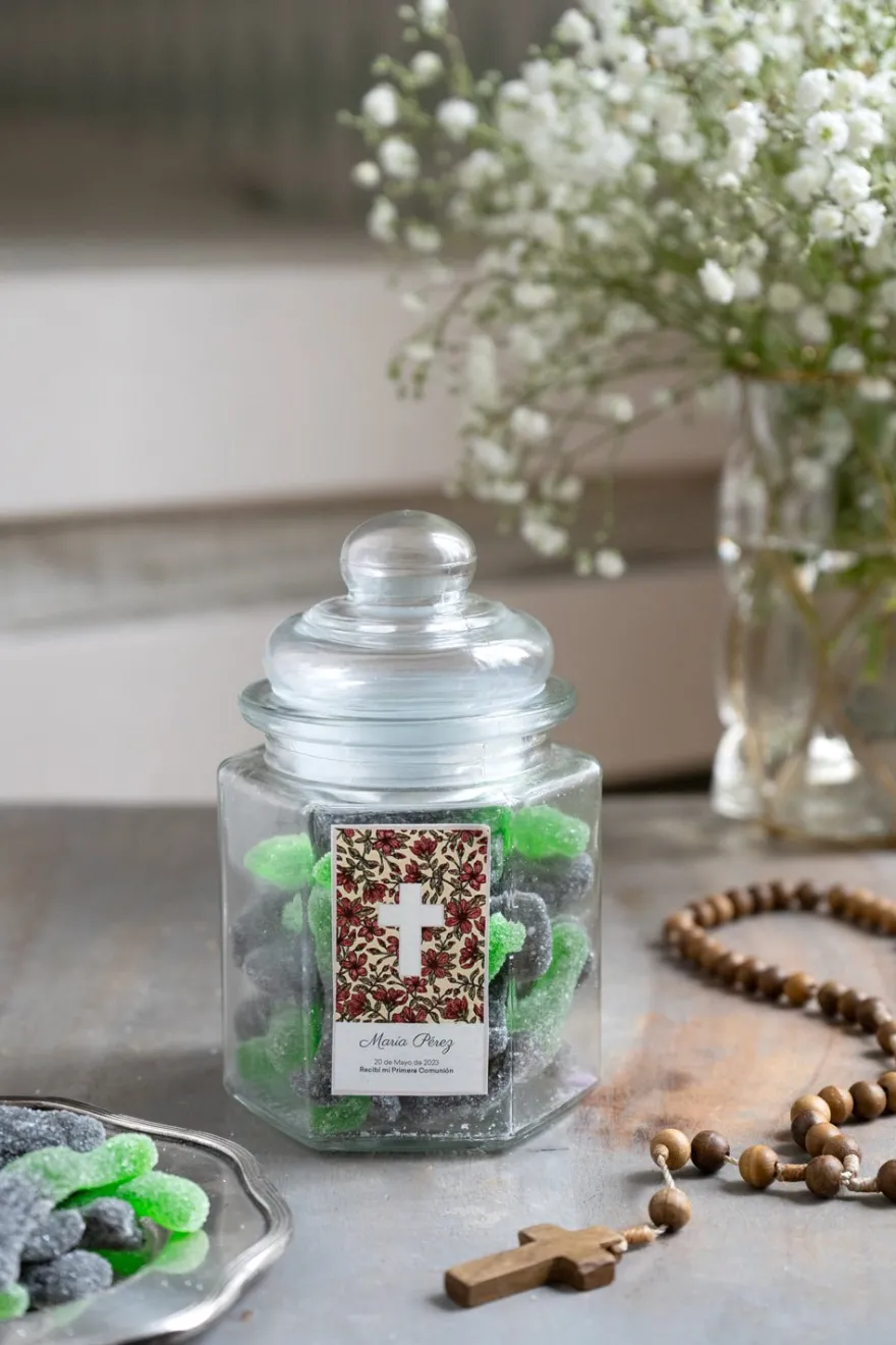 Regala a tus invitados unas golosinas de coca cola sin gluten en tarro de cristal hexagonal personalizado con un recordatorio con el nombre y fecha de la primera comunión.