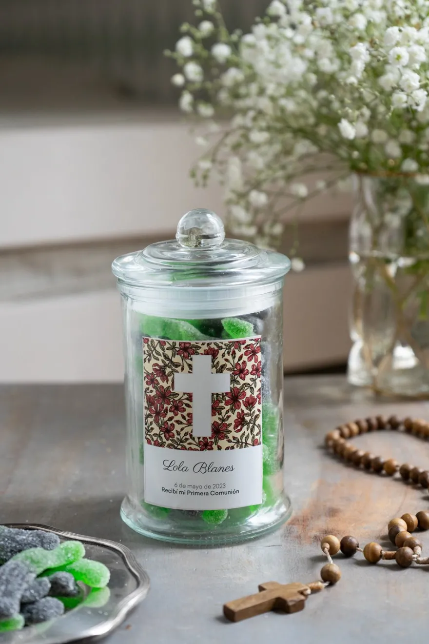 Regala a tus invitados unas golosinas de coca cola sin gluten en tarro de cristal personalizado con un recordatorio con el nombre y fecha de la primera comunión.