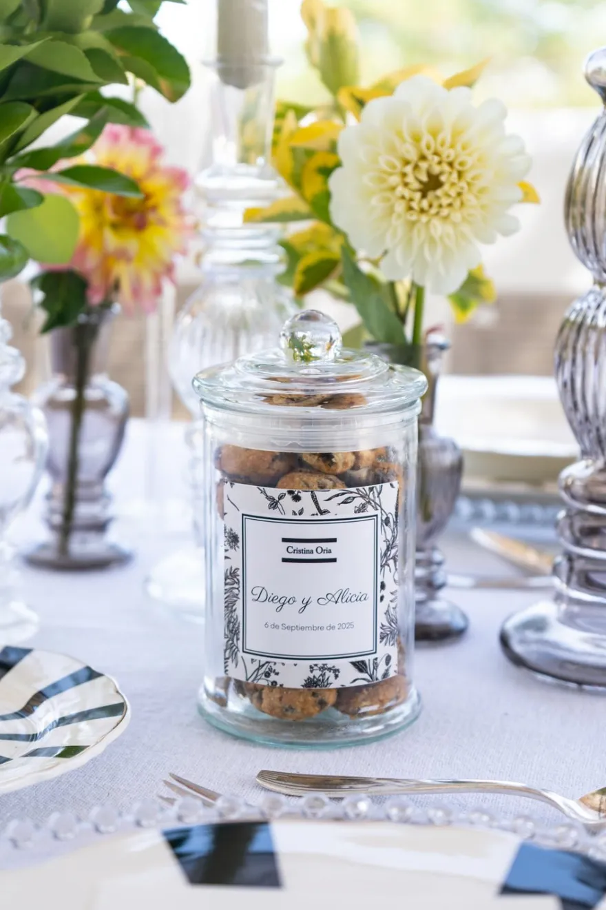 Regala a tus invitados nuestras deliciosas cookies en tarro de cristal personalizado con un recordatorio con vuestros nombres y la fecha del enlace.