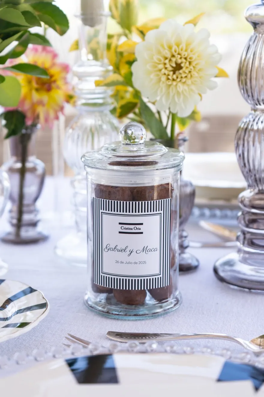 Regala a tus invitados nuestras deliciosas trufas en tarro de cristal personalizado con un recordatorio con vuestros nombres y la fecha del enlace.