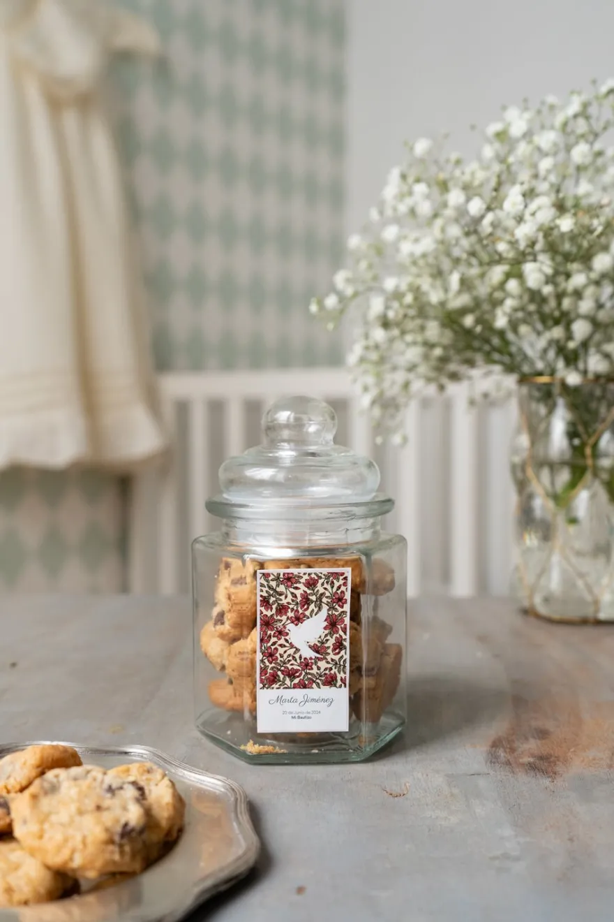 Regala a tus invitados nuestras deliciosas cookies en tarro de cristal hexagonal personalizado con un recordatorio con el nombre y fecha del bautizo.