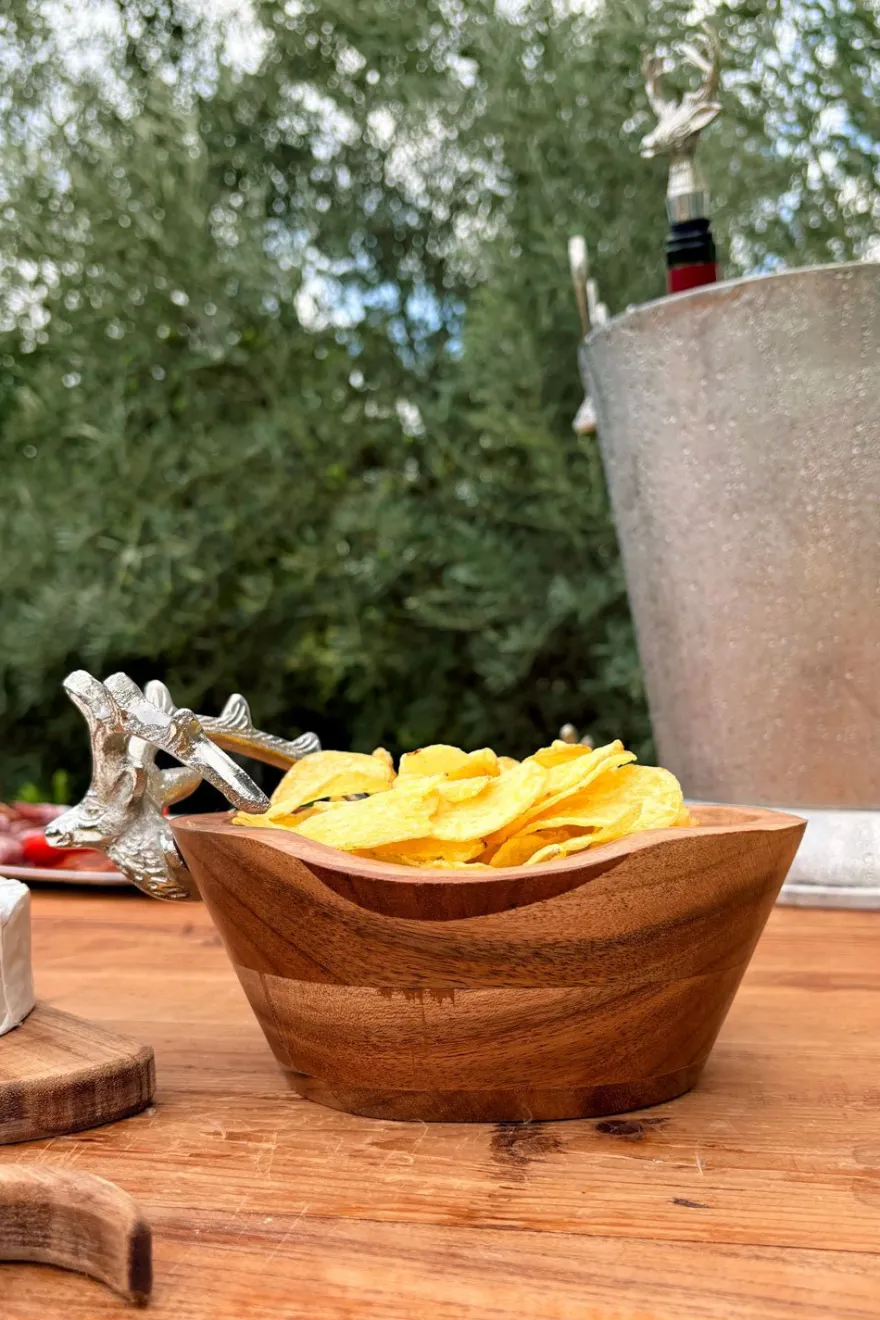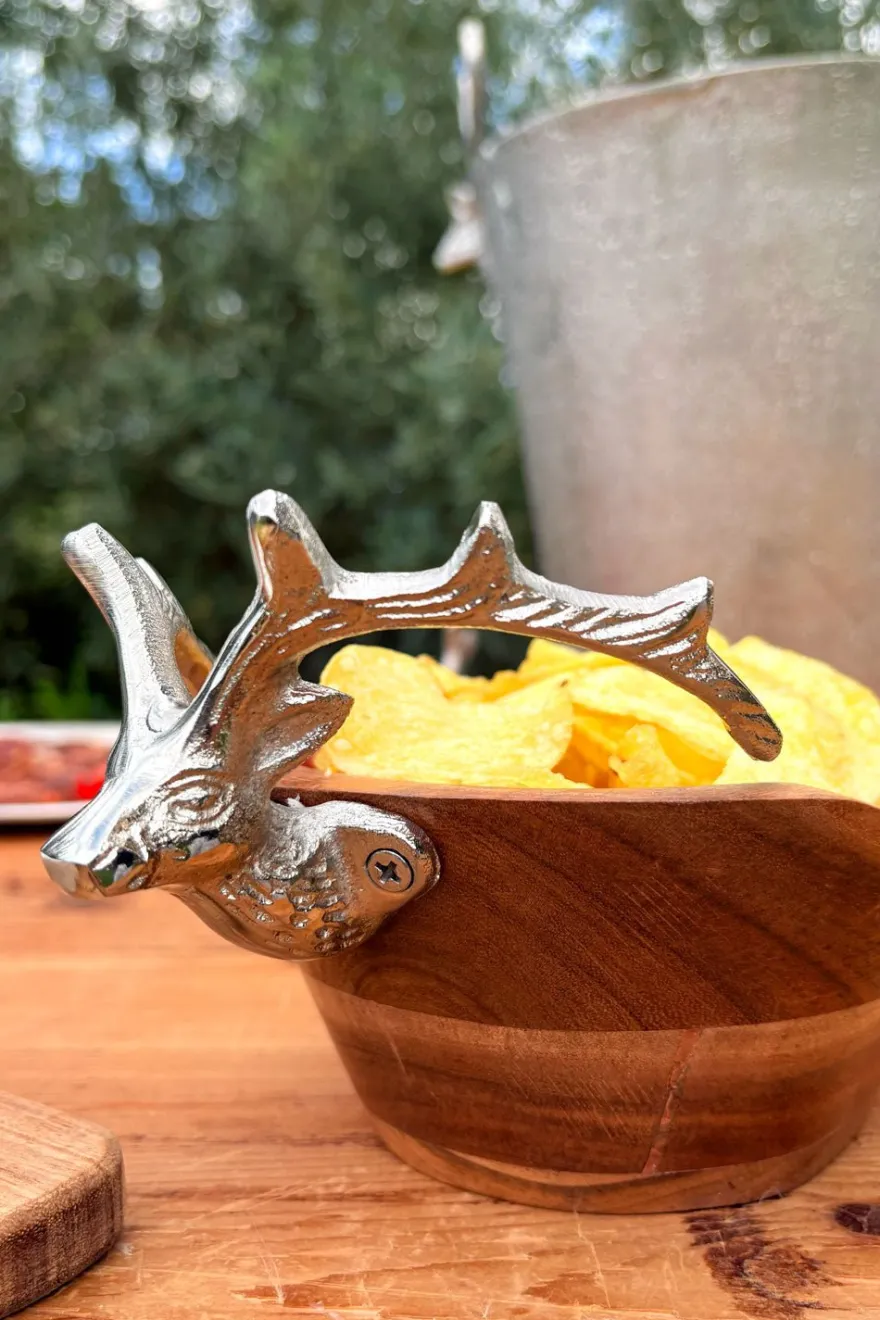 Cuenco de madera con detalle plateado en forma de cabeza de ciervo, que aporta un toque sofisticado y rústico a la vez. Su acabado plateado le da un toque elegante y moderno, perfecto tanto para decorar como para usar en la mesa.