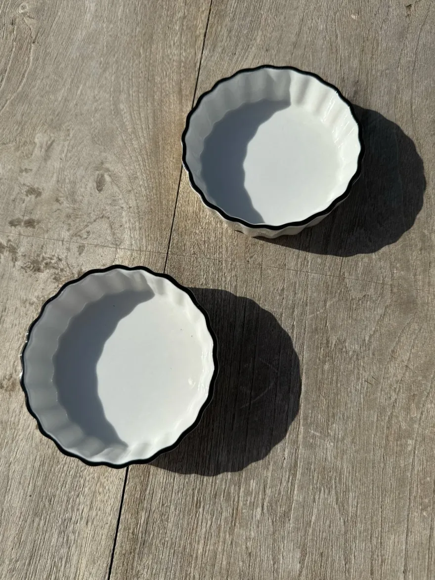 Cuenco con borde ondulado de porcelana de alta calidad con filo negro, resistente al uso diario. Perfecto para servir aperitivos, tapas, salsas y para complementar tus mesas.