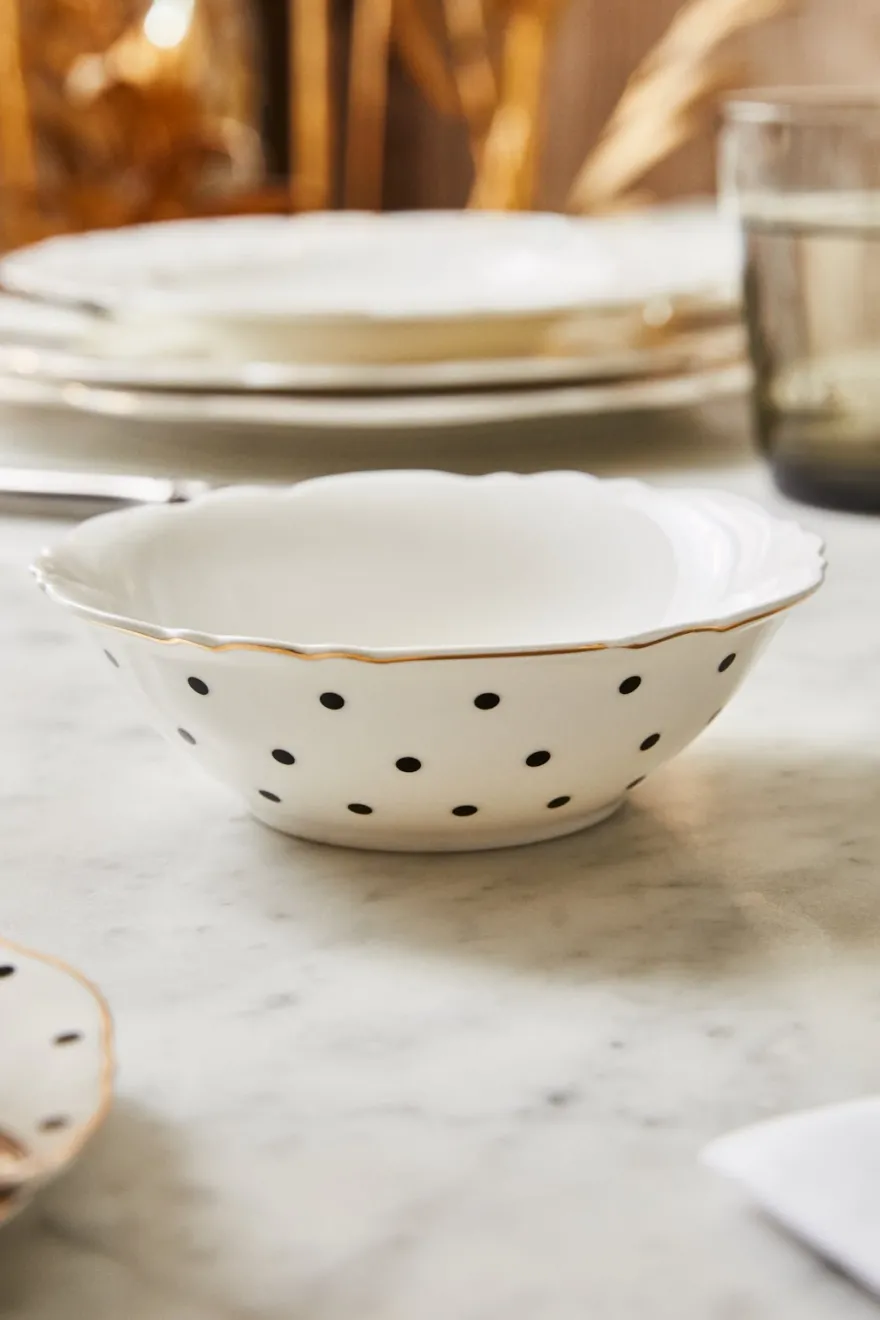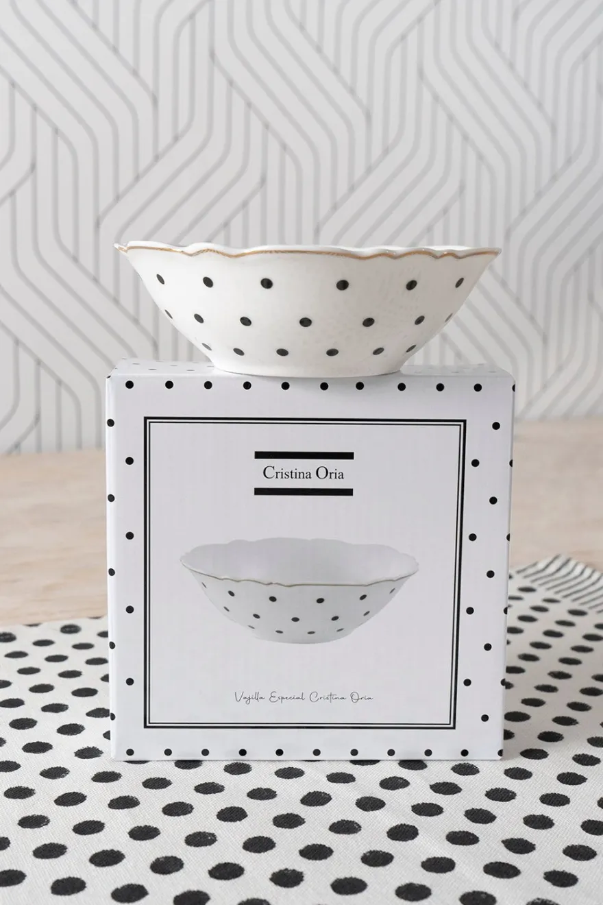 Con nuestro diseño propio de lunares negros en fondo blanco, con borde en color dorado, de nuestra Colección Cristina Oria.