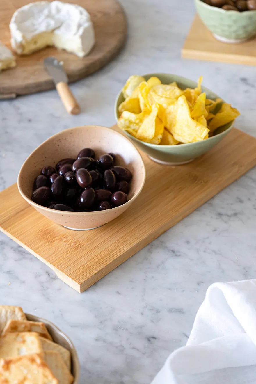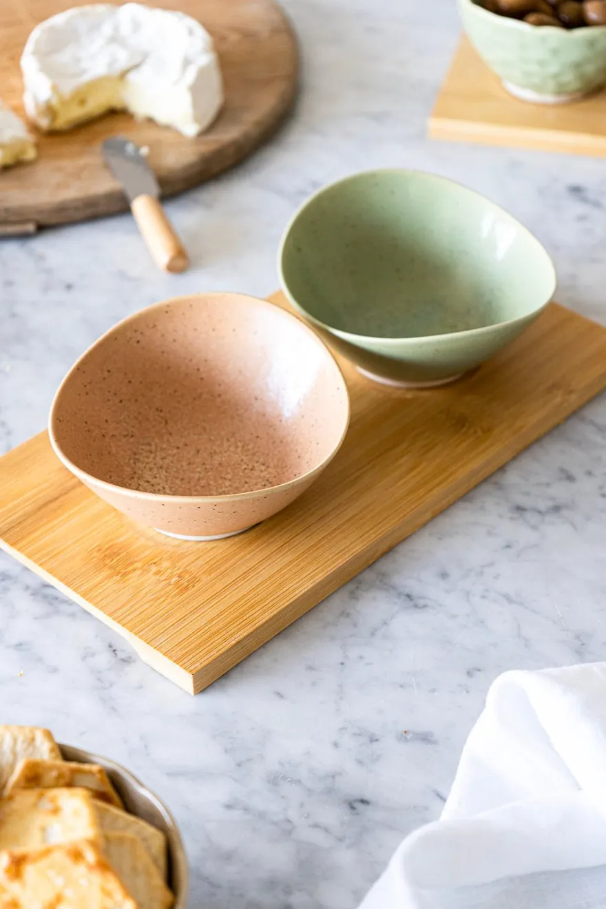 Set de dos cuencos de porcelana con diseño artesanal en dos tonos pasteles, con dos cucharitas sobre base de bambú, perfectos para servir aperitivos, guarniciones del gazpacho, mermeladas y mantequilla…