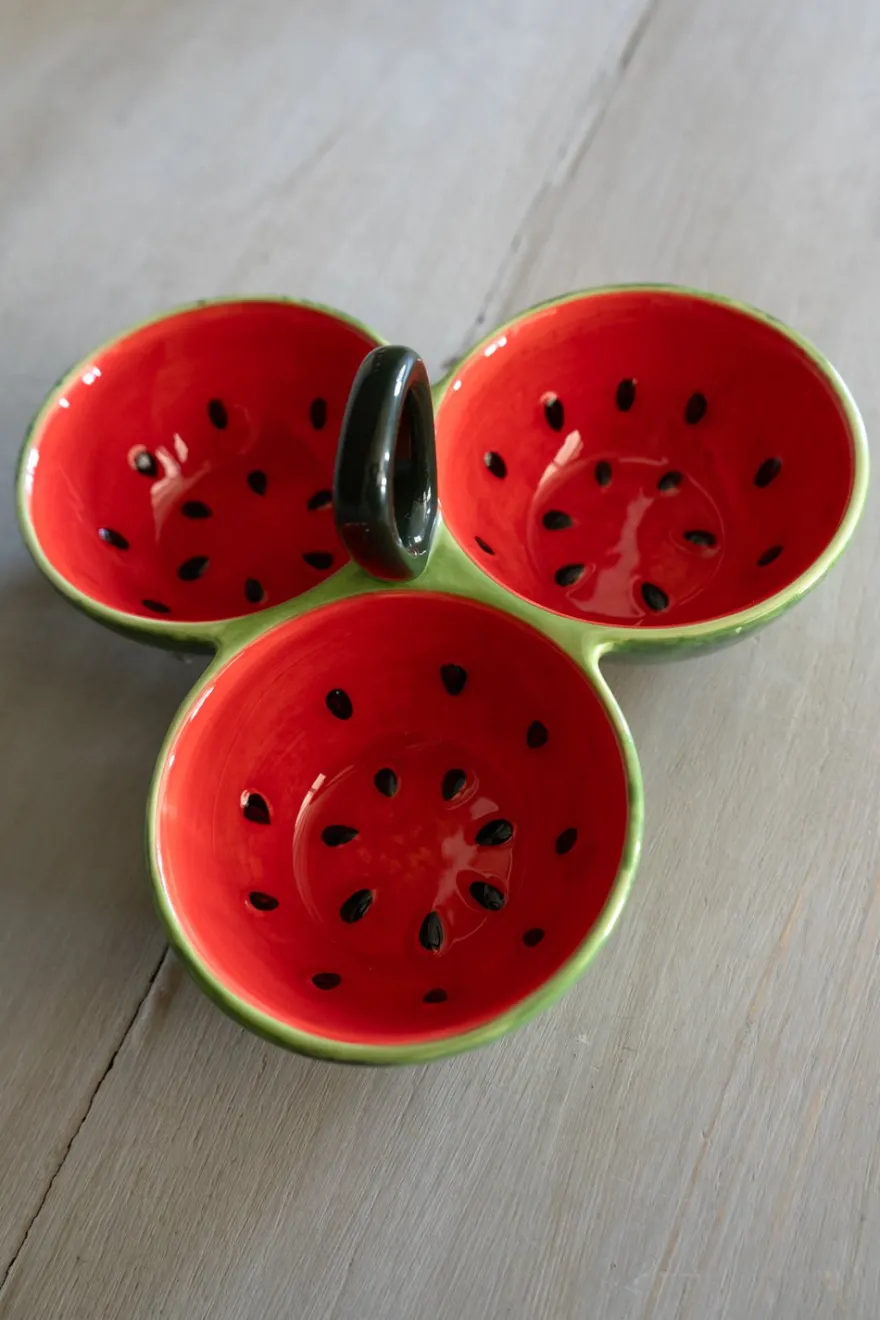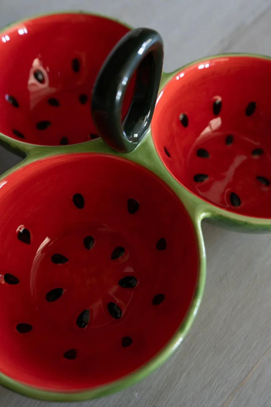 Set de tres cuencos de gres con diseño de sandía, ideal para dar un toque fresco, original y diferente a tus mesas durante cualquier época del año.