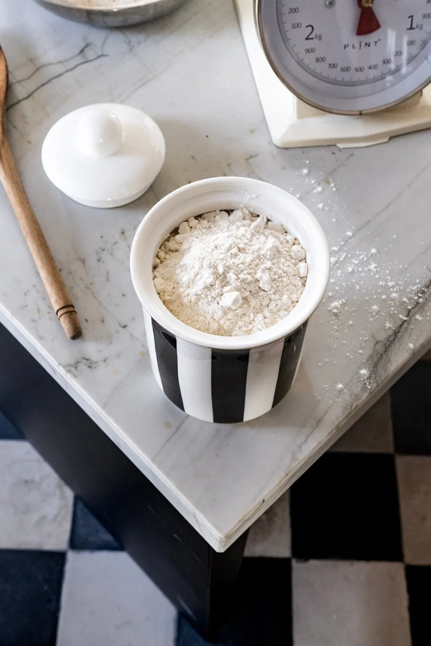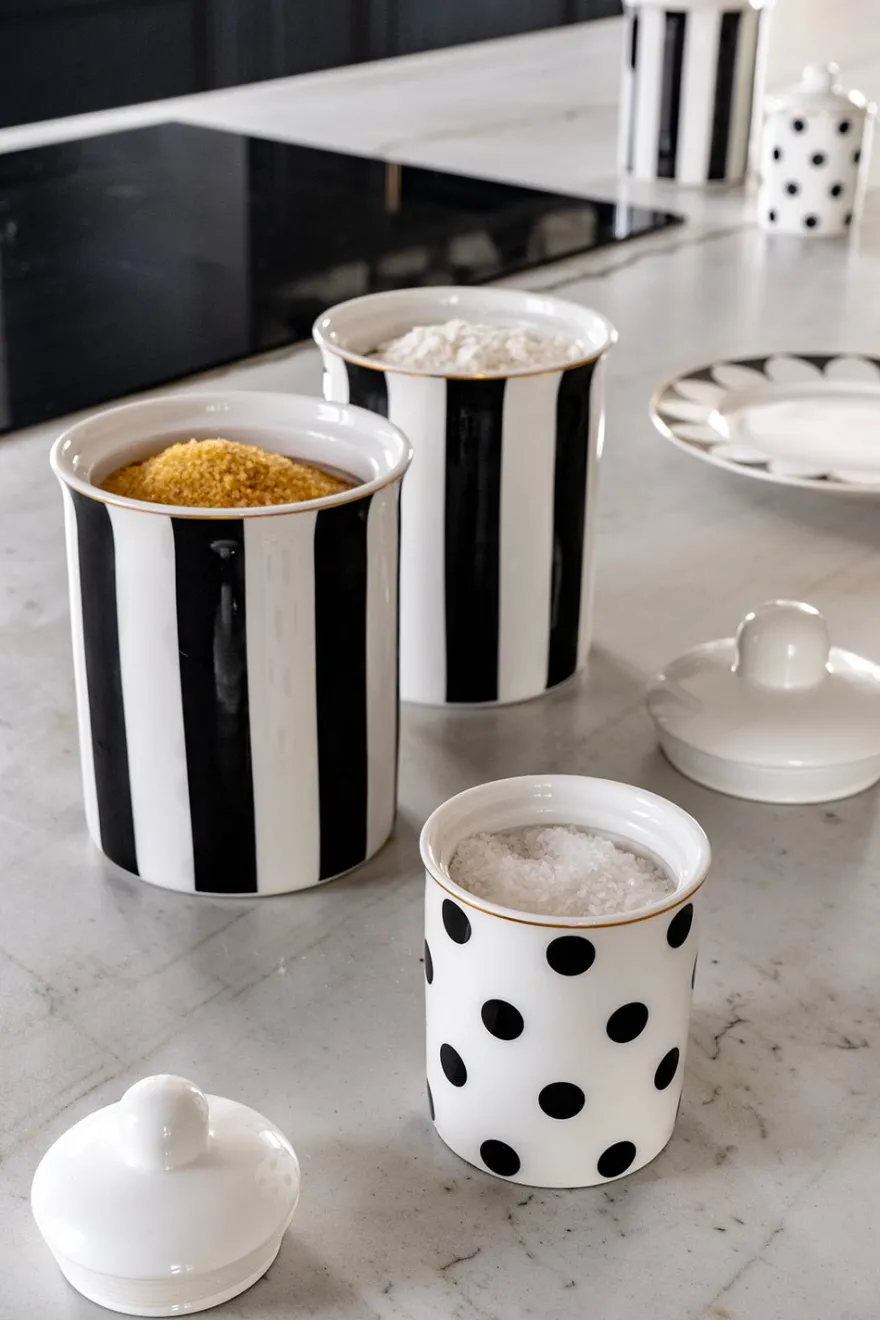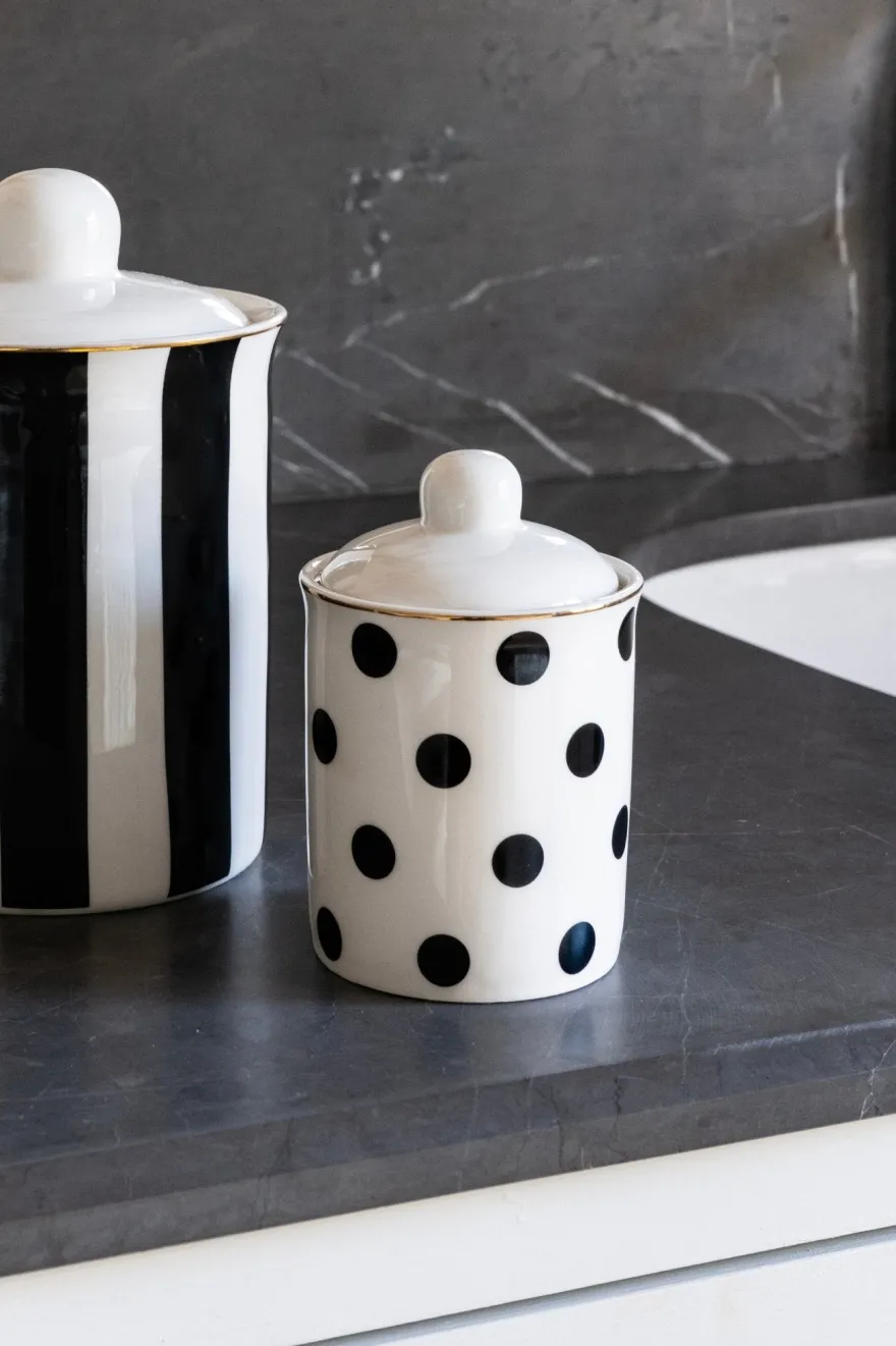 Tarro con tapa y cierre hermético de New Bone China, reconocida por ser muy fina, ligera y resistente, con nuestro diseño propio de puntos negros sobre fondo blanco y delicado filo dorado decorando, de nuestra Colección Cristina Oria.