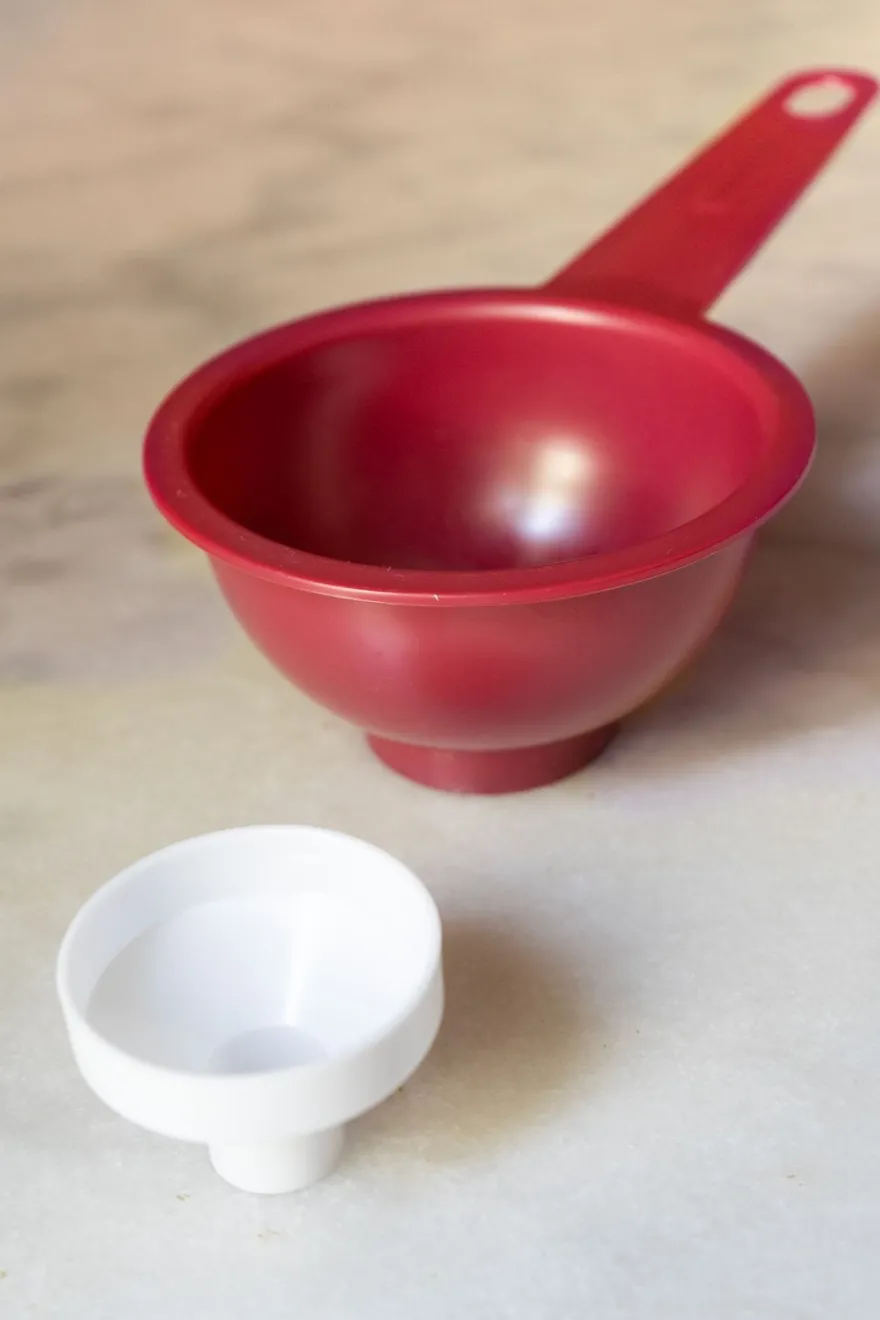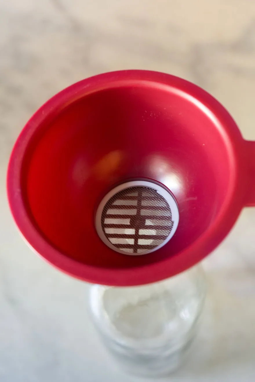Embudo con filtro de malla muy fina, ideal para colar el aceite de freír, la pulpa de los zumos o los jugos resultantes de la cocción.