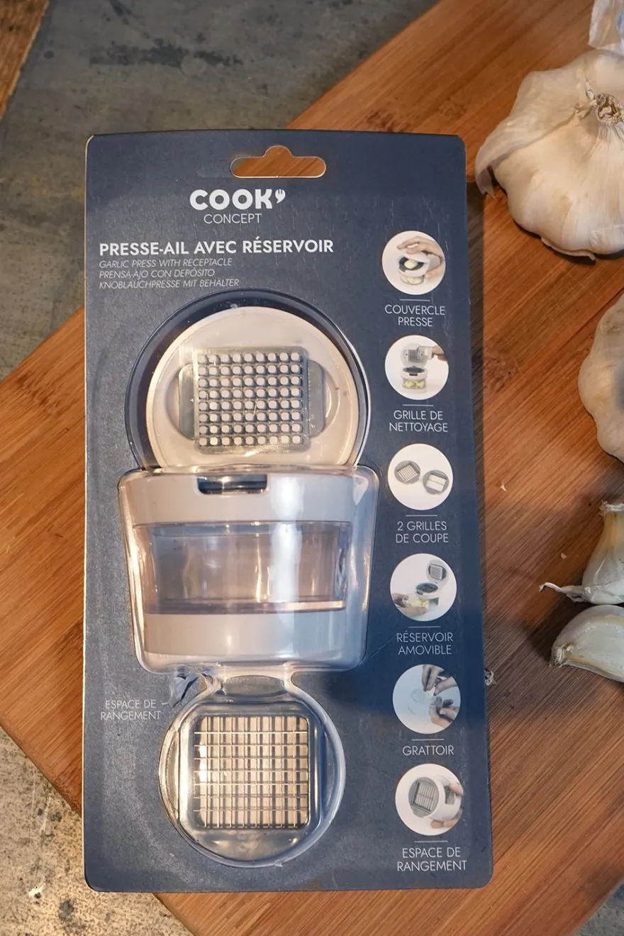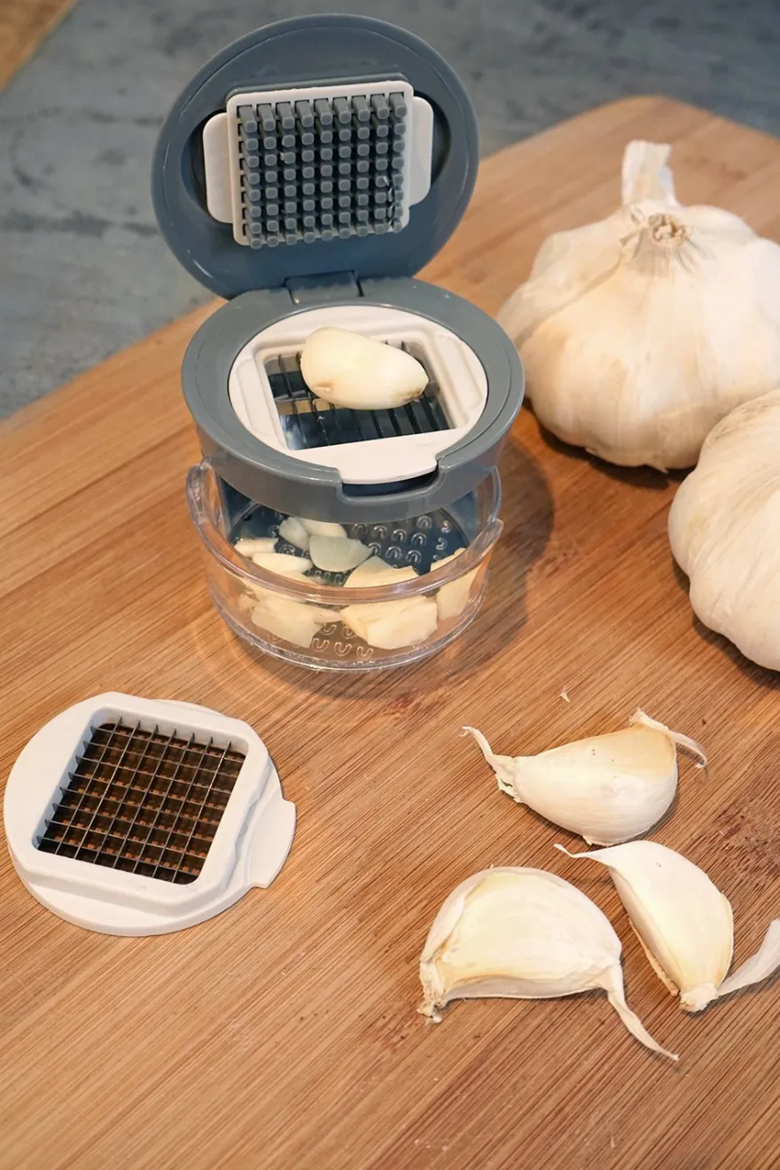Prensador para ajos con dos hojas de corte (láminas y cuadraditos).