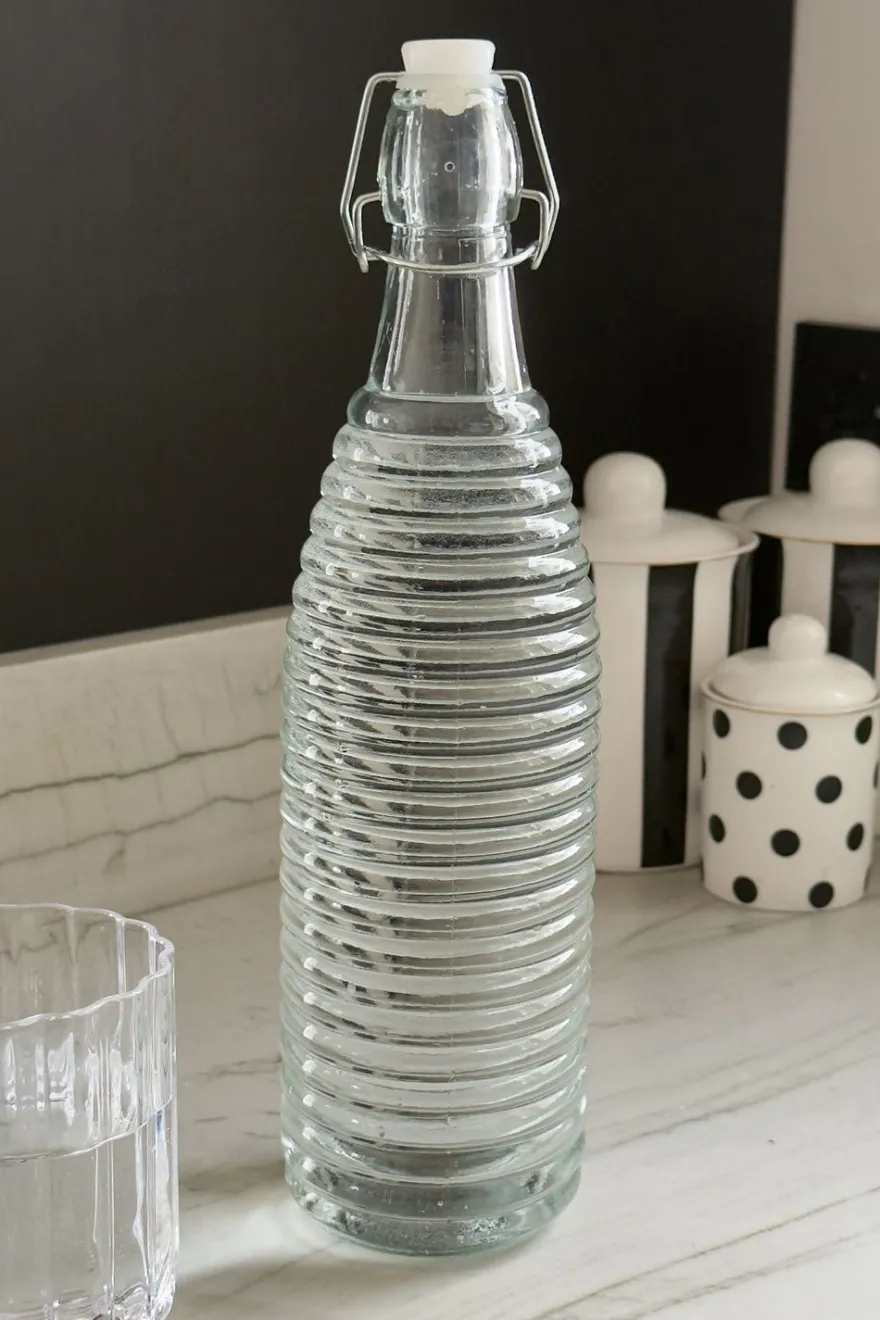 Botella de un litro de capacidad fabricada en vidrio resistente y reutilizable, ideal para agua, zumos, infusiones o bebidas caseras. Incorpora tapón con cierre hermético tipo clip, que garantiza un sellado seguro y conserva mejor el contenido.