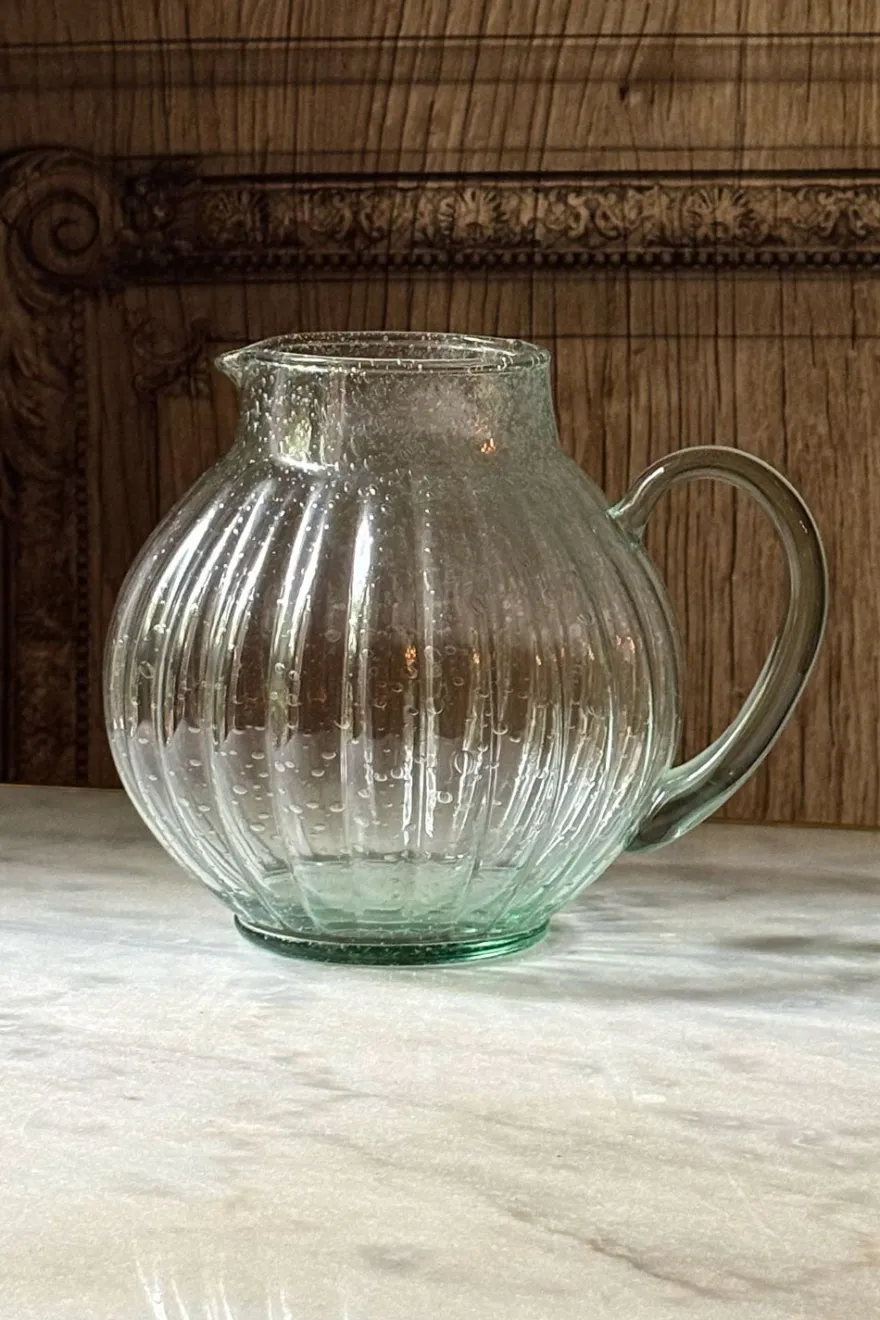 Original jarra con diseño rayado vertical que crea una textura visual atractiva, mientras que las burbujas incrustadas en el vidrio evocan frescura y movimiento. El tono verde añade un aire natural, ideal para cenas al aire libre, reuniones informales o simplemente para embellecer tu cocina o mesas.