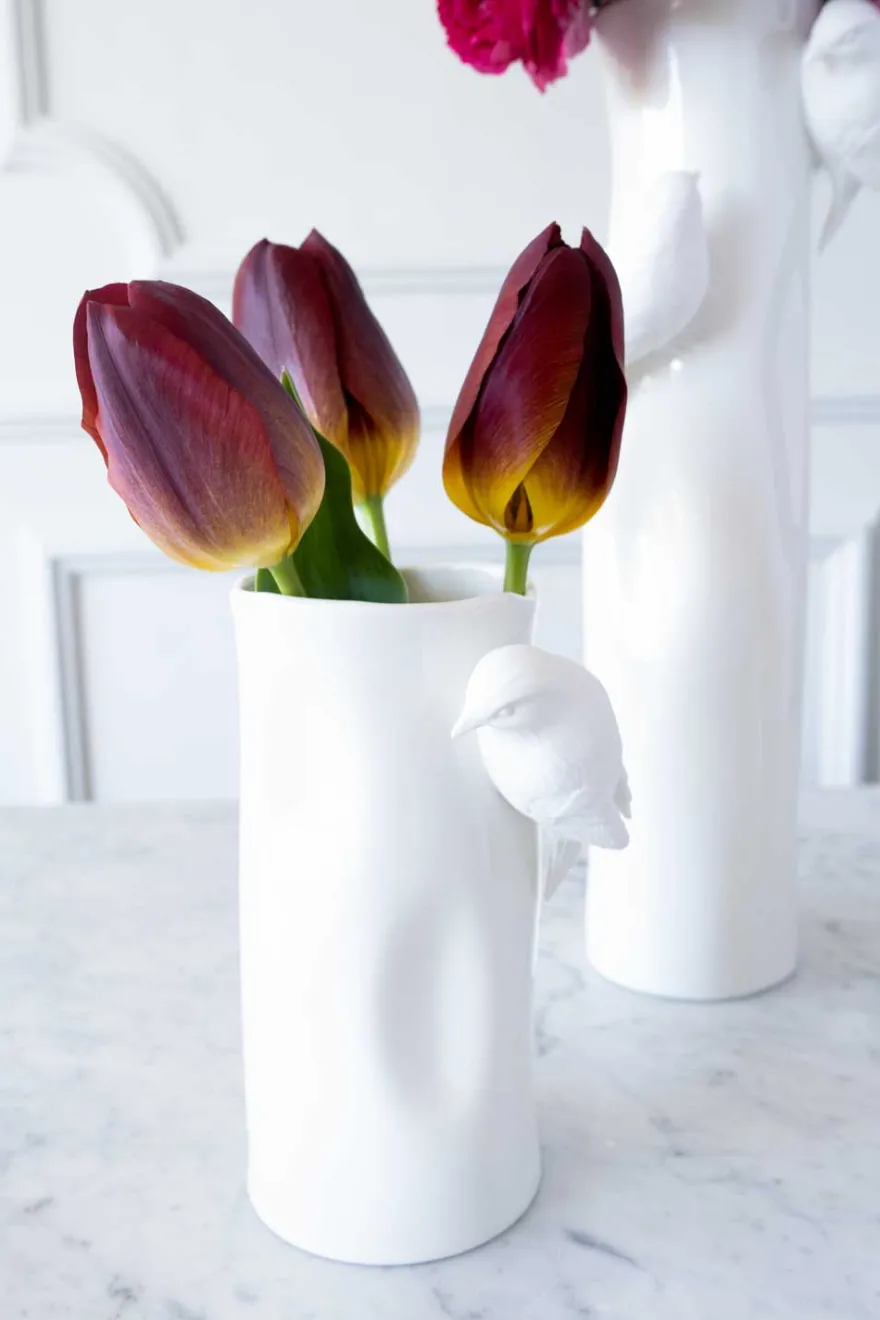 Florero de porcelana en color blanco con dos figuras de pájaros en los laterales.