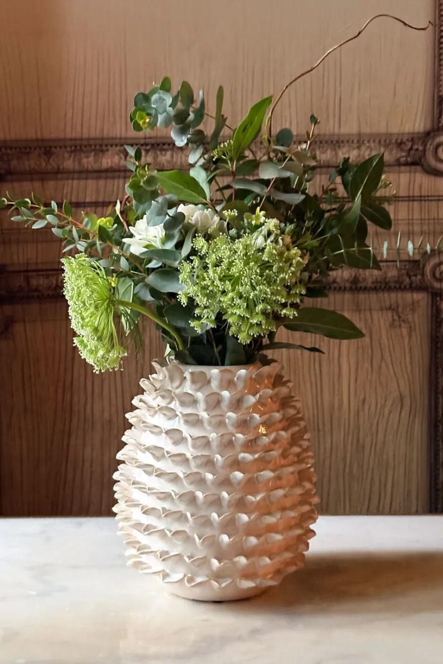 Jarrón de cerámica con un sutil relieve de hojas pequeñas que recorre su superficie, aportando un aire natural y delicado. De estilo versátil y armonioso, es una pieza ideal para complementar cualquier espacio, ya sea como elemento decorativo por sí solo o como soporte para flores naturales o secas.