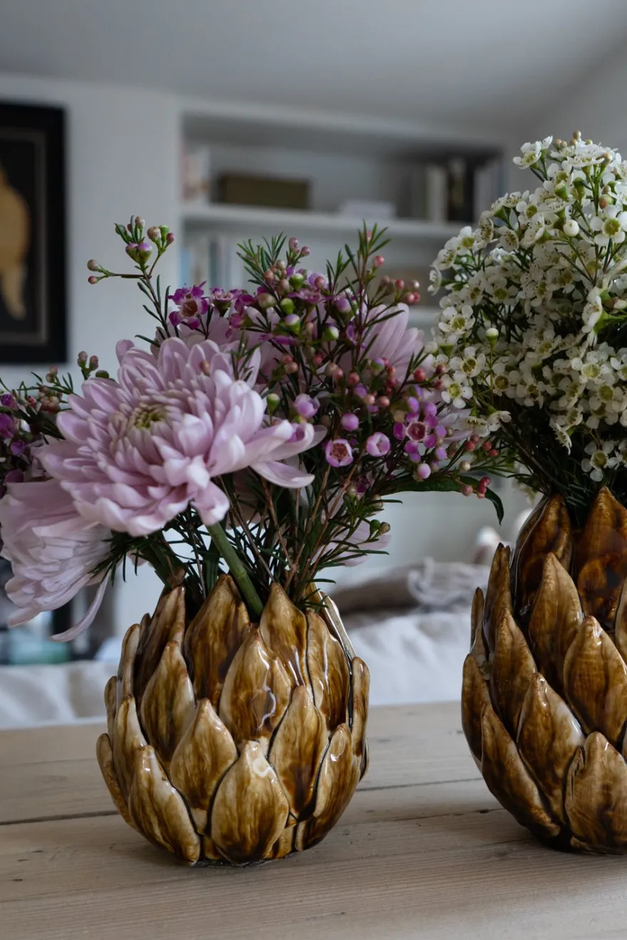 Jarrón de cerámica esmaltada con diseño de alcachofa en tonalidades marrones, 100% artesanal, ideal para complementar y dar un toque fresco, original y diferente a cualquier rincón de tu casa, ya sea interior o exterior. Puedes llenarlo con flores, o simplemente usarlo para decorar sin nada en su interior.