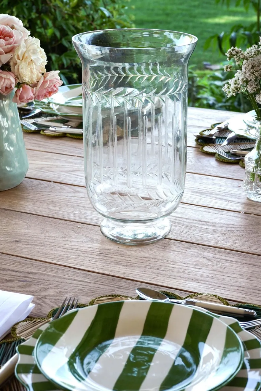 Jarrón grande de cristal soplado y tallado a mano que destaca por su elegancia atemporal y su meticuloso trabajo artesanal. Las irregularidades del diseño hacen única cada pieza.
