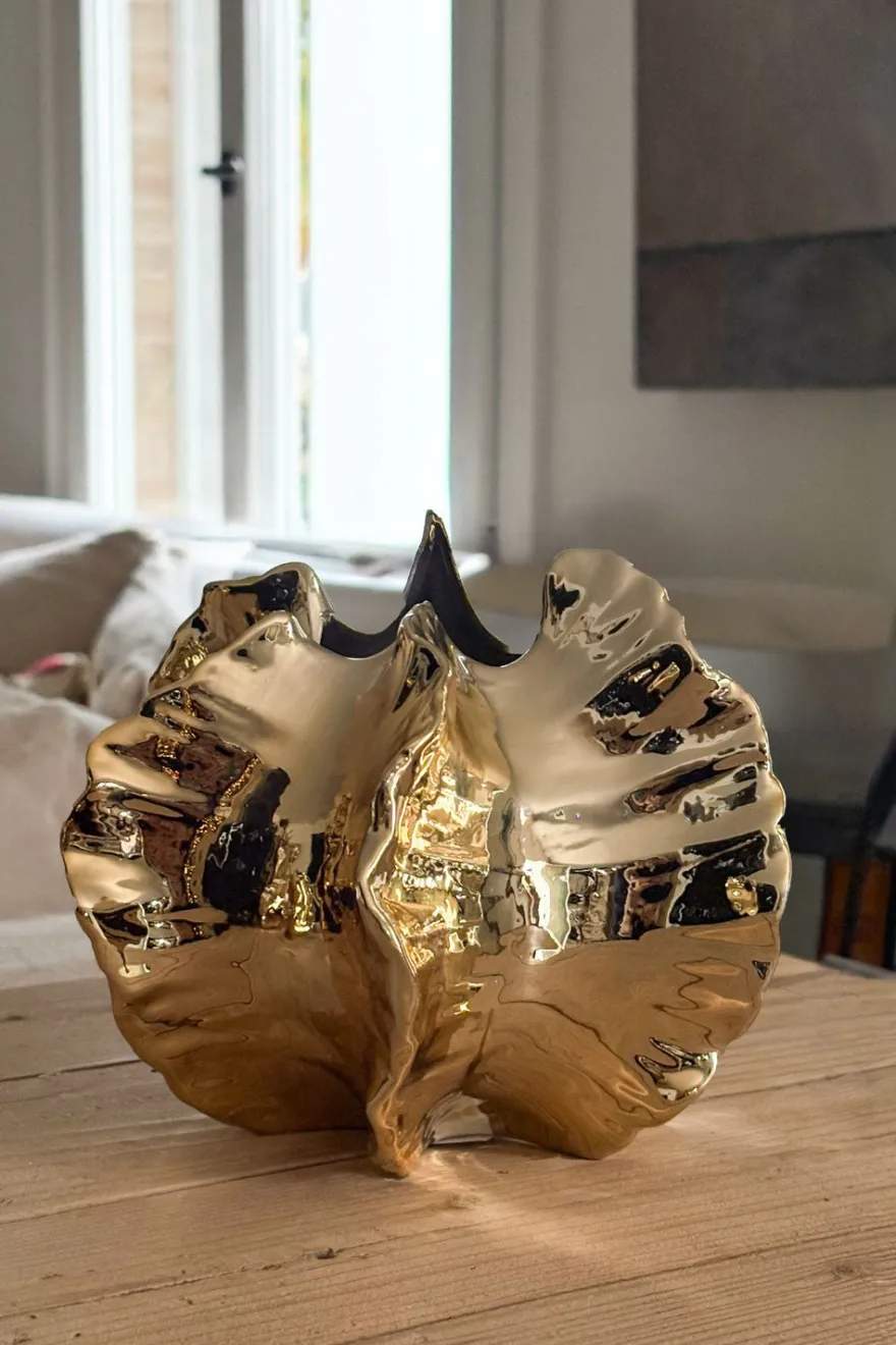 Jarrón de cerámica con un original diseño irregular y un acabado dorado brillante que aporta sofisticación y modernidad a cualquier espacio. Su forma escultórica lo convierte en una pieza decorativa por sí misma, ideal para destacar en mesas, estanterías o recibidores. Perfecto para añadir un toque de estilo y luminosidad.