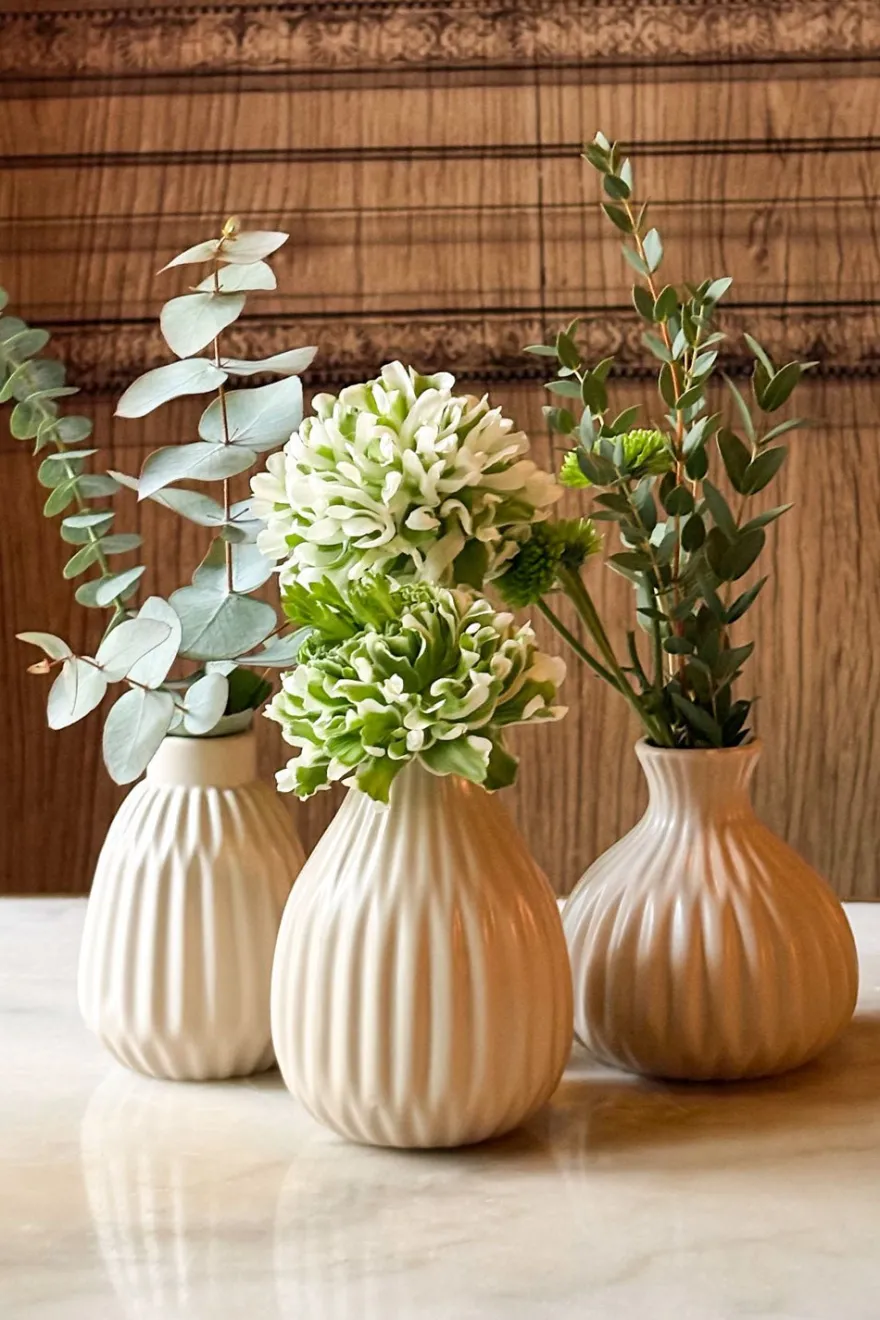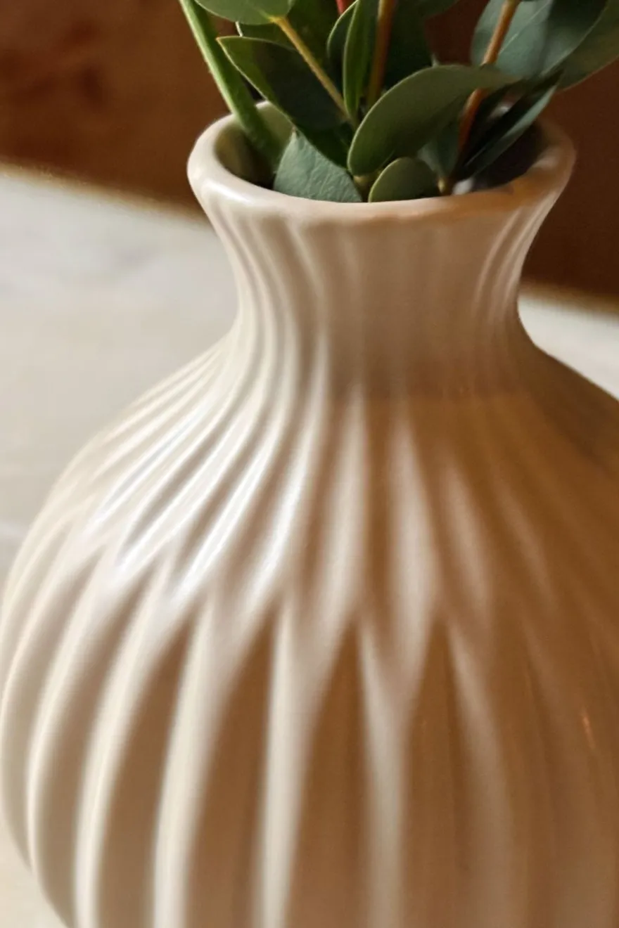 Jarrones de porcelana en tono beige suave, con un delicado relieve estriado que aporta textura y ritmo a la forma. Su acabado mate y líneas orgánicas transmiten calma y naturalidad, convirtiéndolos en piezas versátiles que funcionan tanto solas como en conjunto. Ideales para flores frescas, secas o como objeto decorativo atemporal.