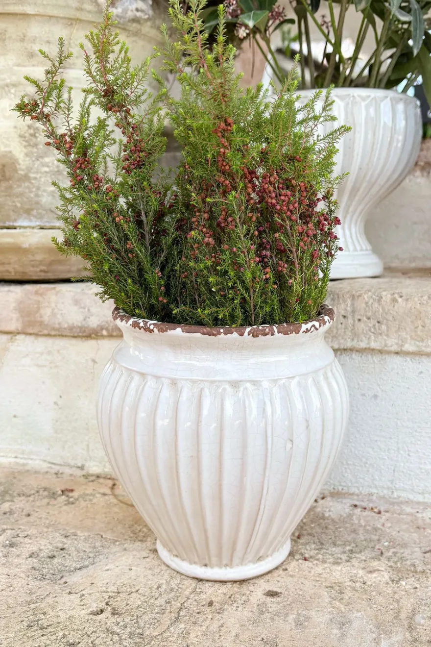 Colección de jarrones decorativos elaborados en porcelana blanco roto, diseñados para aportar elegancia a cualquier espacio. Su acabado en tono neutro y su relieve estriado resaltan un estilo atemporal que se integra fácilmente a diferentes tipos de decoración, tanto por si solos como con plantas o arreglos florales.