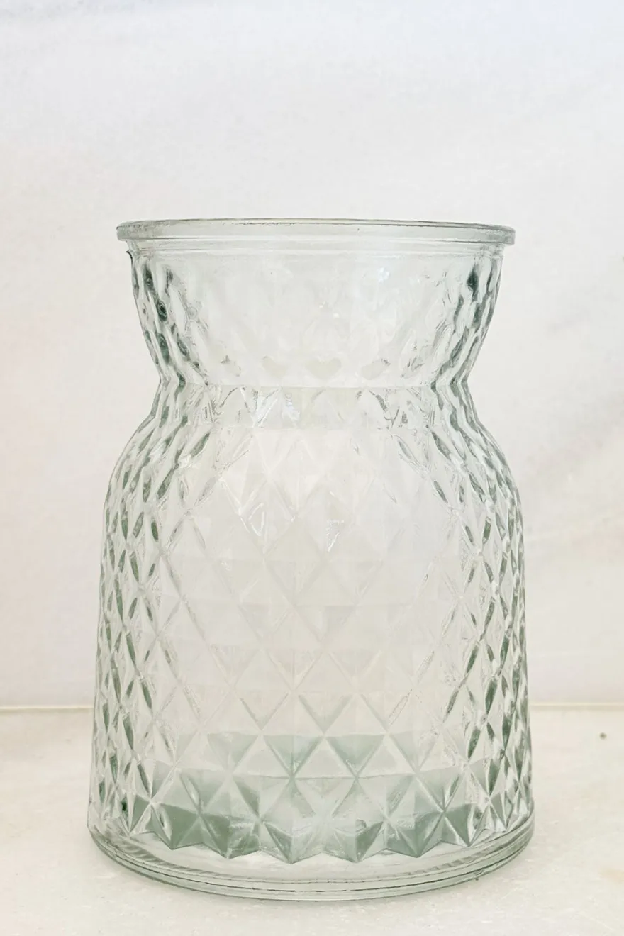 Jarrón de cristal decorativo con acabado texturizado tipo tallado, ideal para aportar un toque de elegancia y frescura a cualquier espacio. Su diseño lo convierte en una pieza versátil tanto para flores naturales como preservadas.
