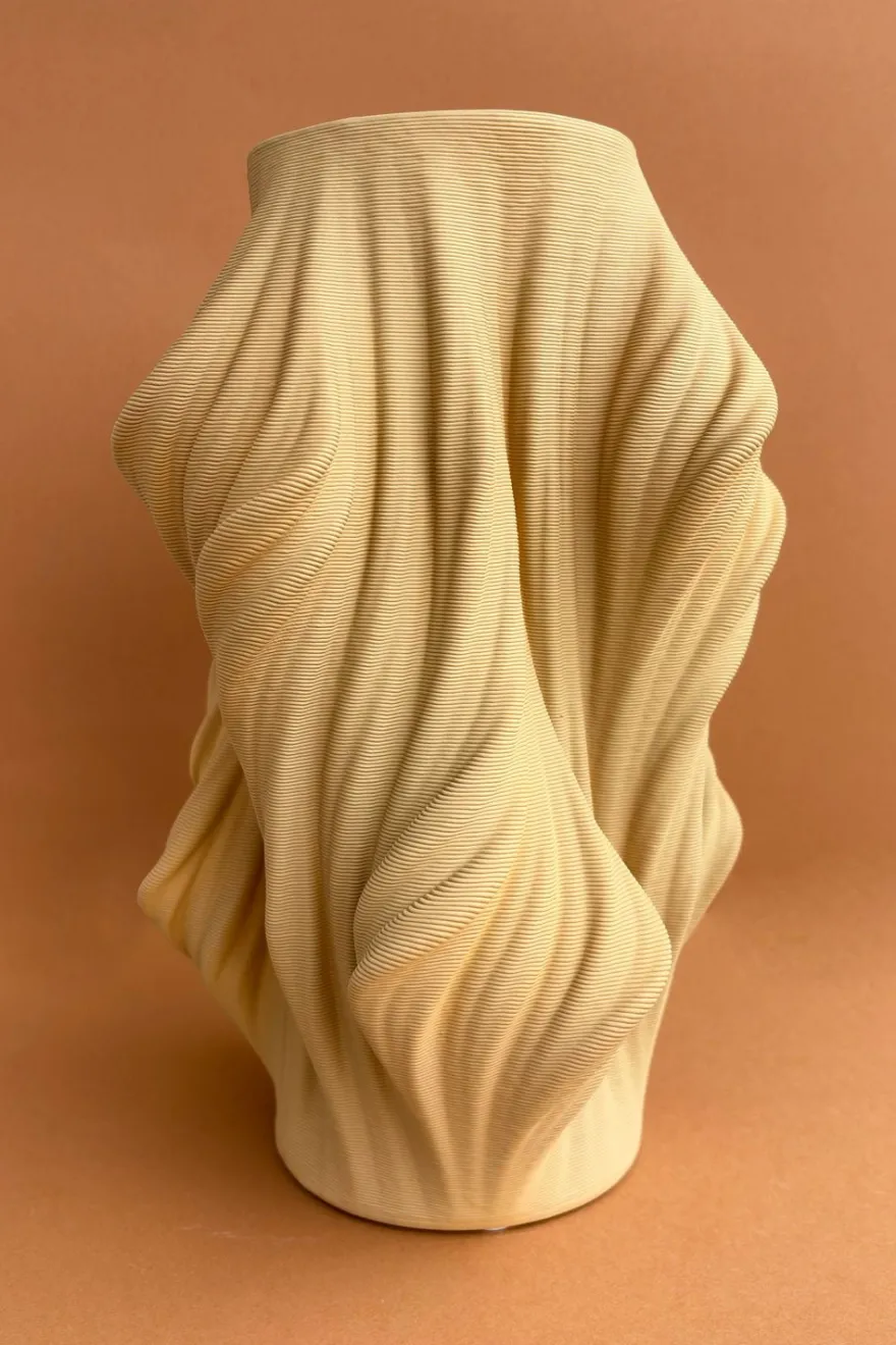 Jarrón de porcelana en color beige, con un diseño irregular que aporta un toque de modernidad y estilo único a cualquier espacio. Presenta un efecto 3D que resalta su forma y textura, creando una pieza decorativa que juega con la luz y la profundidad. Perfecto para añadir un toque artístico a tu casa, ya sea para flores frescas o como pieza decorativa por sí sola.