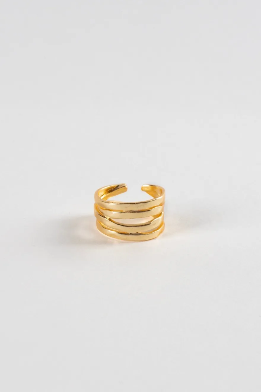 Anillo ajustable de latón bañado en oro para lograr un acabado brillante y duradero con diseño de cuatro argollas, ideal tanto para el día a día como para cualquier ocasión especial.