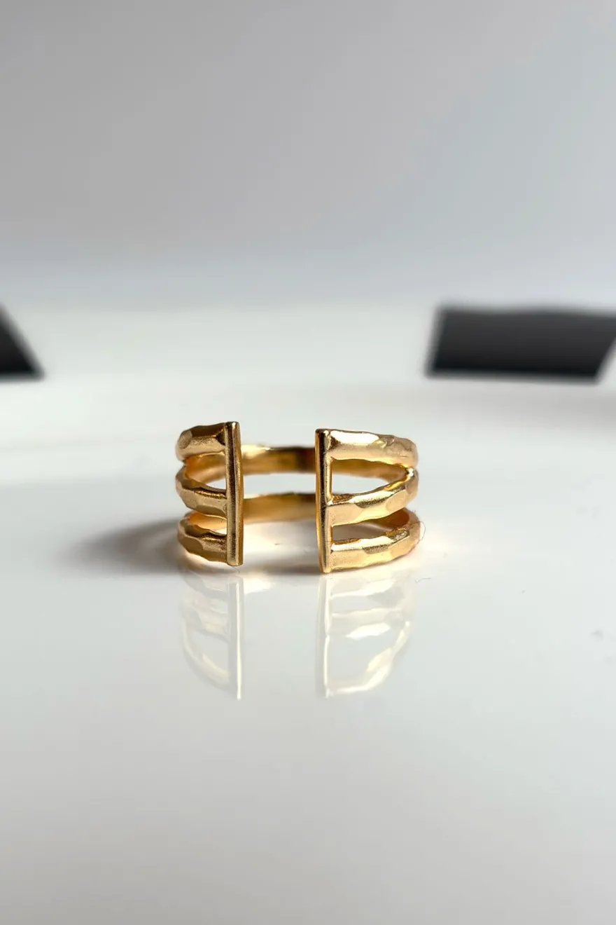 Anillo ajustable de latón bañado en oro para lograr un acabado brillante y duradero con diseño de tres argollas, ideal tanto para el día a día como para cualquier ocasión especial.