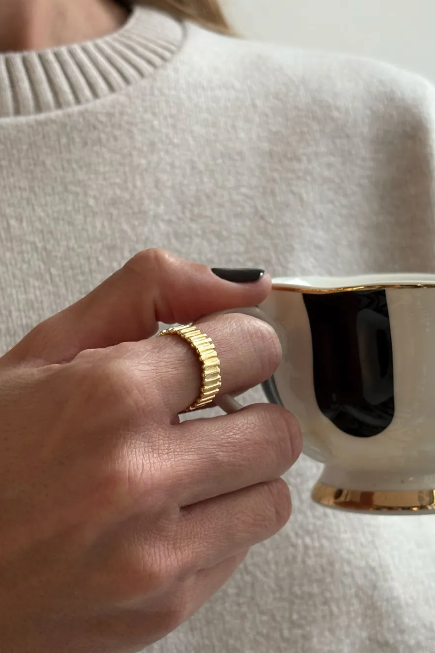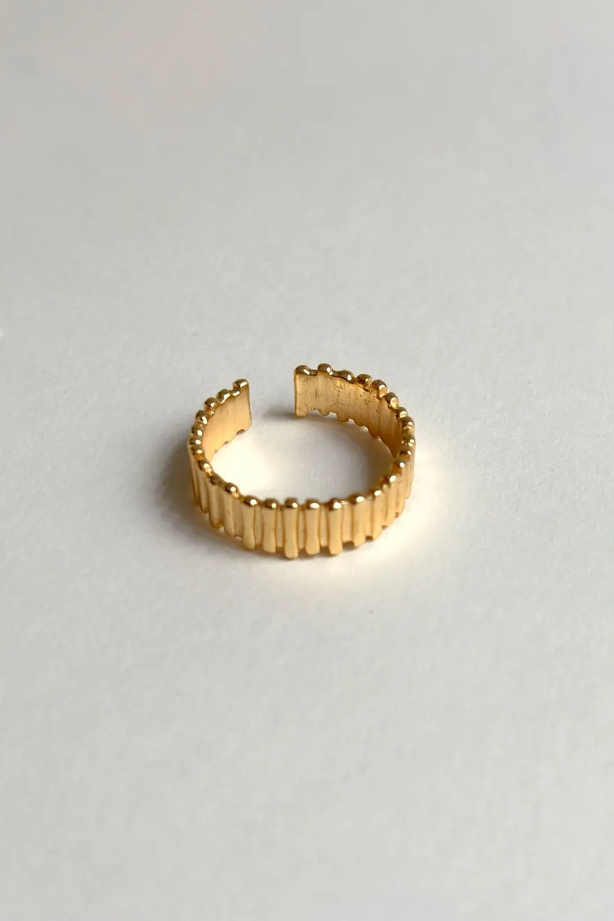 Anillo ajustable de latón bañado en oro para lograr un acabado brillante y duradero con diseño irregular, ideal tanto para el día a día, como para cualquier ocasión especial.