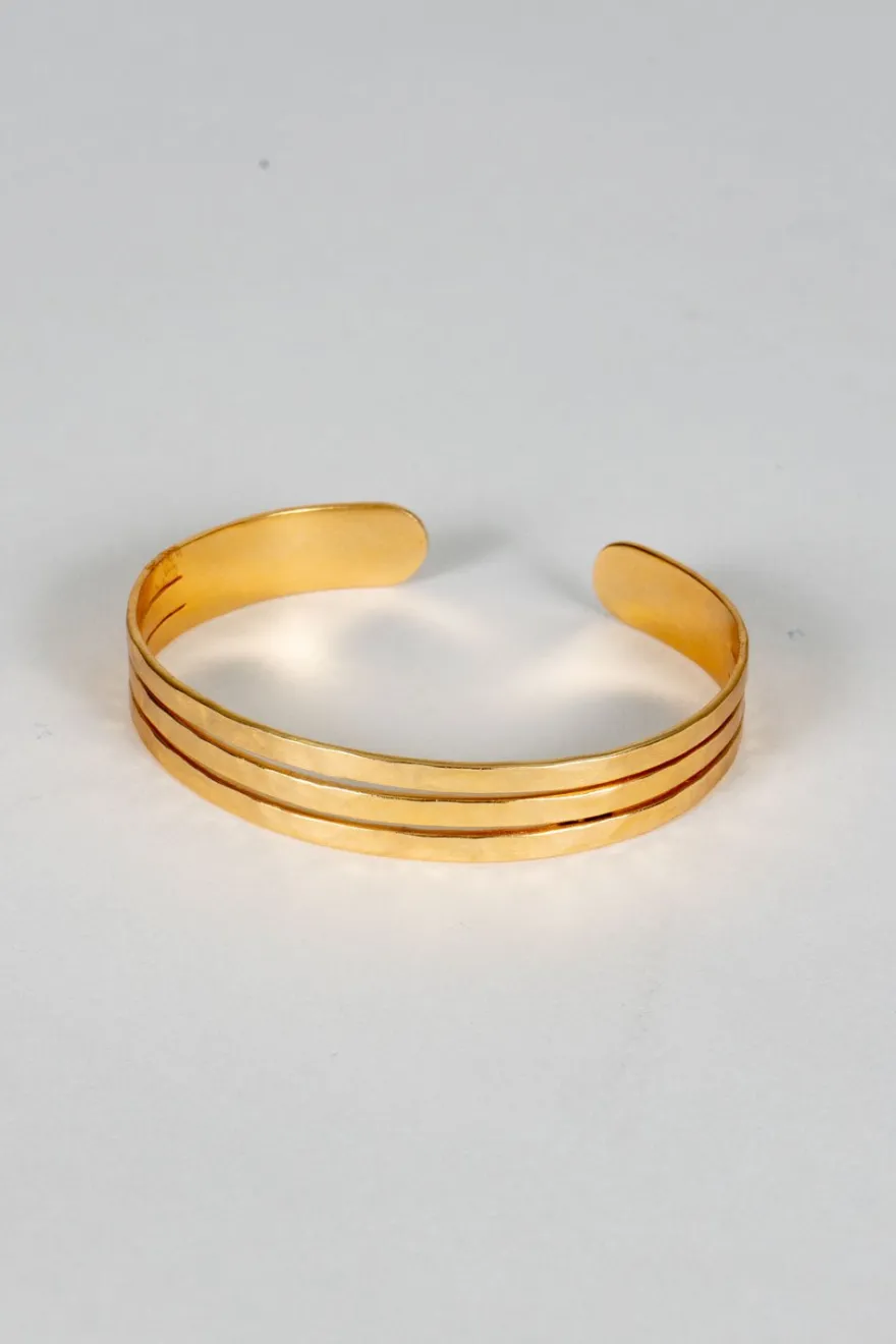 Brazalete ajustable de latón bañado en oro para lograr un acabado brillante y duradero con diseño de tres argollas, ideal tanto para el día a día como para cualquier ocasión especial.