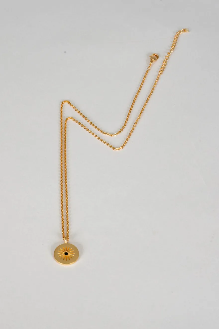 Collar de latón bañado en oro para lograr un acabado brillante y duradero con colgante redondo y detalle de circonita negra, ideal tanto para el día a día como para cualquier ocasión especial.